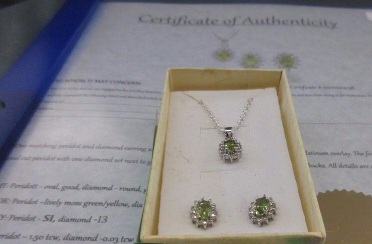 NECKLACE & EARRINGS SET - 1.5CT OVAL FACETED PERIDOT & DIAMONDS IN STERLING SILVER SETTING - INCLUDES CERTIFICATE $400