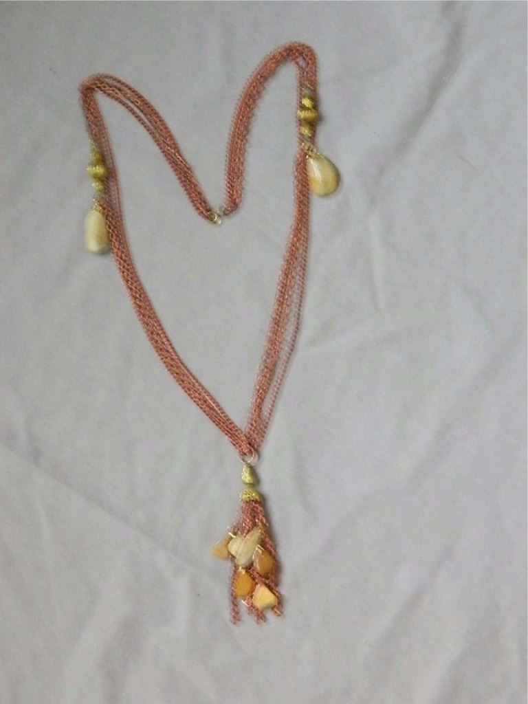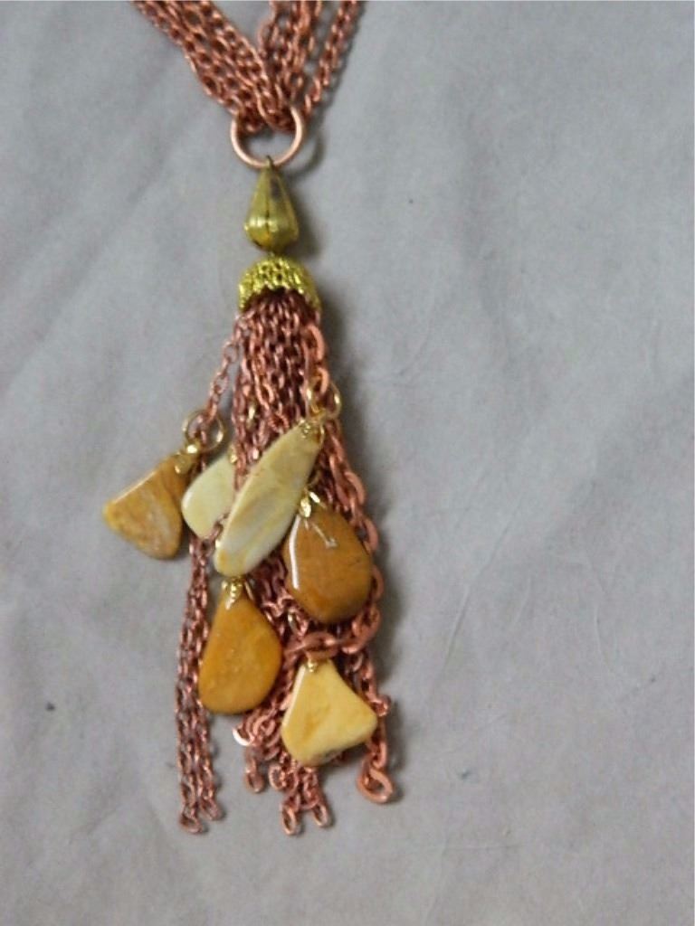 NECKLACE - MULTI CHAIN NECKLACE WITH COPPER LIKE CHAIN AND FREE FORM POLISHED STONES - 30"