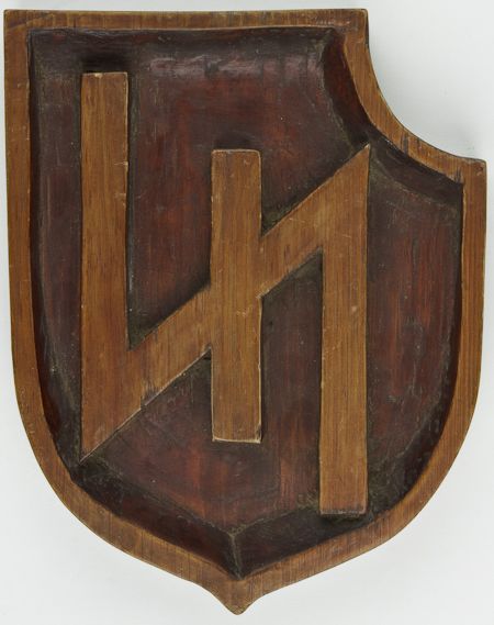 Wooden folk art, a hand-carved plaque, 8" x 10 1/4", bearing a stylized impression of the symbol of the Nederland Division, Dutch soldiers who volunteered to join the SS.