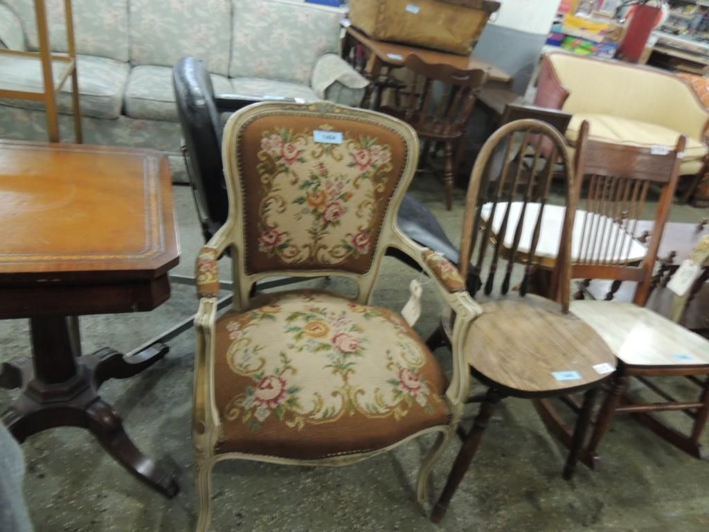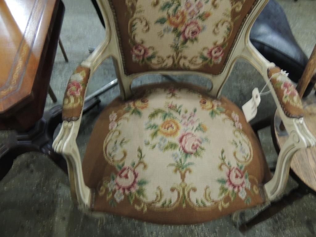 NEEDLEPOINT BERGERE CHAIR. NEEDLE POINT CHAIR. FLOWER DESIGN. AS SHOWN SEE PHOTO FOR MORE DETAILS.