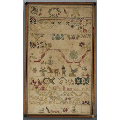 NEEDLEWORK SAMPLER 16"x9", early 19th century CONDITION REPORT: toning, stains. PACKING AND SHIPPING: offered by Fairfield Auction to points within Continental U.S.A. and excluding insurance (which will be required and added) $30.