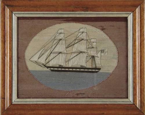 NEEDLEWORK/WOOL WORK PORTRAIT OF A BRITISH SAILING VESSEL. Fully rigged three-mast ship flies British flag shown sailing right to left under full sail. The portrait is shown in oval form with a rose colored border. Housed in an antique birdseye maple gold lined frame. Circa 1835-1850. SIGHT SIZE: 13” x 17-1/2”. CONDITION: Some minor restoration, very good. 9-27953