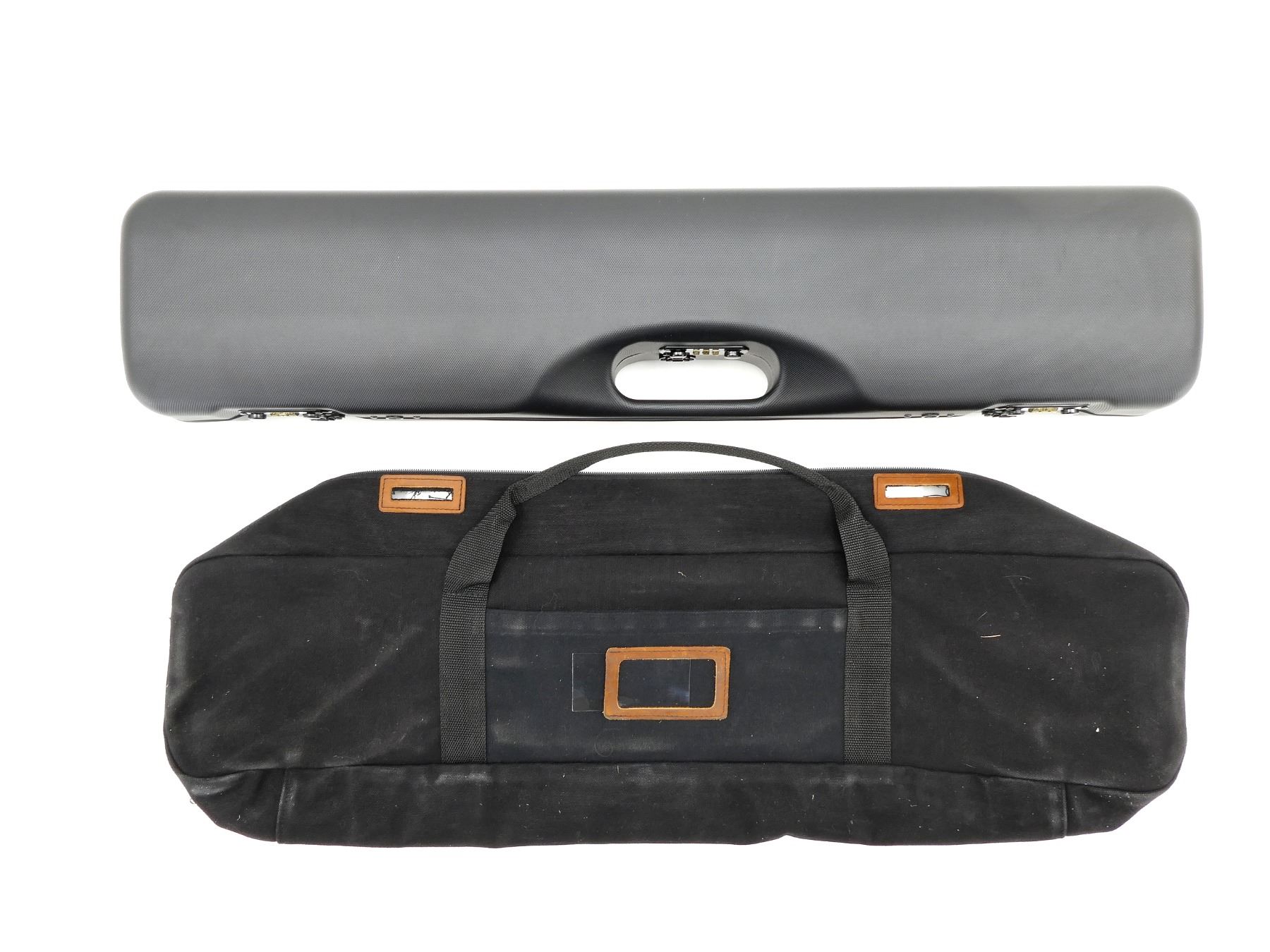 LOT INCLUDES; (1) BLACK ULTRA-COMPACT HUNTING SHOTGUN CASE, CARRY HANDLE, SHOULDER STRAP, (3) COMBINATION LOCKS, BARREL LENGTH UP TO 30" + CHOKES, (1) BLACK FITTED CASE COVER BY INTEL CASE, APPROX. OAL 31", SHOWS WEAR AND TEAR FROM USAGE, SEE PHOTOS.
