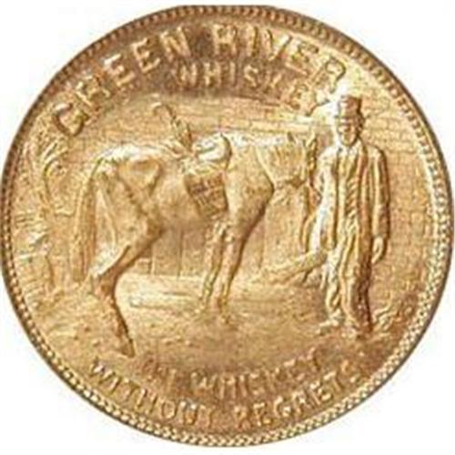 GREEN RIVER WHISKEY TOKEN -- 1930?s, 1¼" diameter, gold washed copper, Negro man with old nag horse