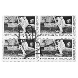 <b>1236. NEIL ARMSTRONG</b> (b. 1930) American astronaut and commander of the Apollo 11 mission, the first man to walk on the Moon. Bold signature on a block of four postage stamps honoring the "<i>First Man on the Moon</i>", matted with a portrait and framed. Fine.<b> $200-300</b>