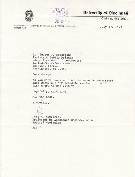 (b. 1930) American astronaut and commander of the Apollo 11 mission, the first man to walk on the Moon. T.L.S. "Neil" on University of Cincinnati, Dept. of Aerospace, Engineering and Applied Mechanics letterhead, 1p. 4to., July 27, 1979, just days over a decade after he first set foot on the moon. Armstrong writes the U.S. Superintendent of Documents regretting that they were unable to meet in Washington. Docket at top, else fine. Sold with CHUCK YEAGER S.P., 4" x 6" color, artist's portrait boldly signed, and CLYDE TOMBAUGH, A.Q.S. on a white card: "Clyde W. Tombaugh, Discovered 9th planet, Pluto, on 18 Feb. 1930". Three pieces.