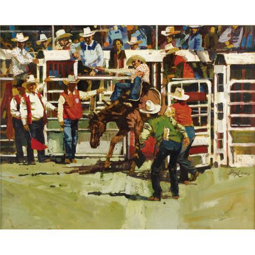 <B>NEIL BOYLE (1931-2006)</B></I><BR>Untitled Rodeo Bucking Bronc<BR>Oil on canvas<BR>24in. x 30in.<BR>Signed lower right<BR><BR>Neil Boyle catches the action in this rodeo as if caught "freeze-frame."<BR><BR> <B>Condition Report:</B> Excellent condition. Period frame in excellent condition.<BR><BR><b>Shipping:</b> Requires 3rd Party Shipping (<a target="_blank" href="http://www.heritageauctions.com/common/shipping.php">view shipping information</a>)