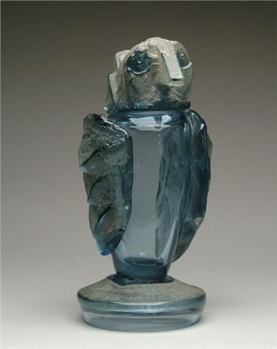 NEIL DROBNIS BIRD FIGURE. Handblown aqua glass figure of stylized bird has applied wings and head. Wings, head and base have sand textured finish. Signed on base "Neil Drobnis '92". SIZE: 14 in. t. CONDITION: Very good to excellent. 5-60825