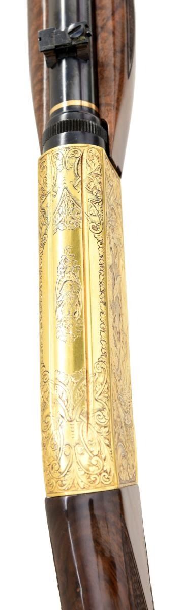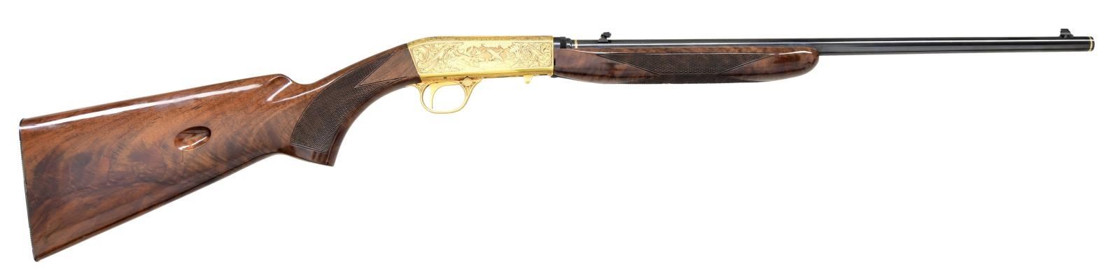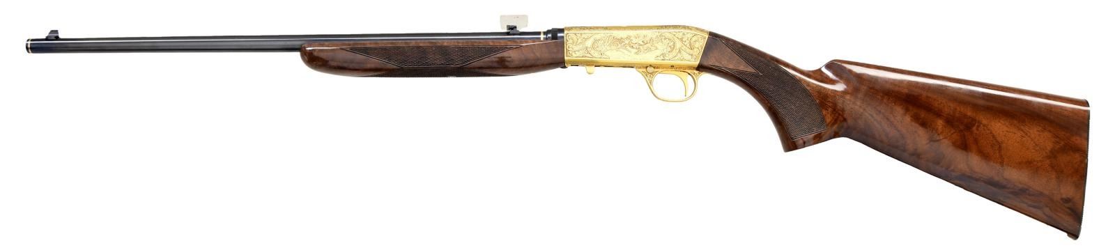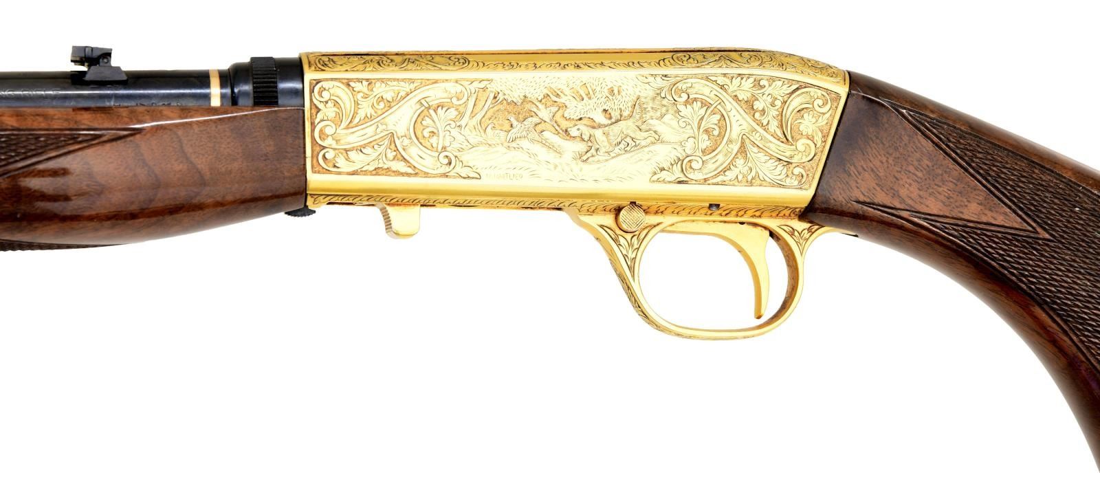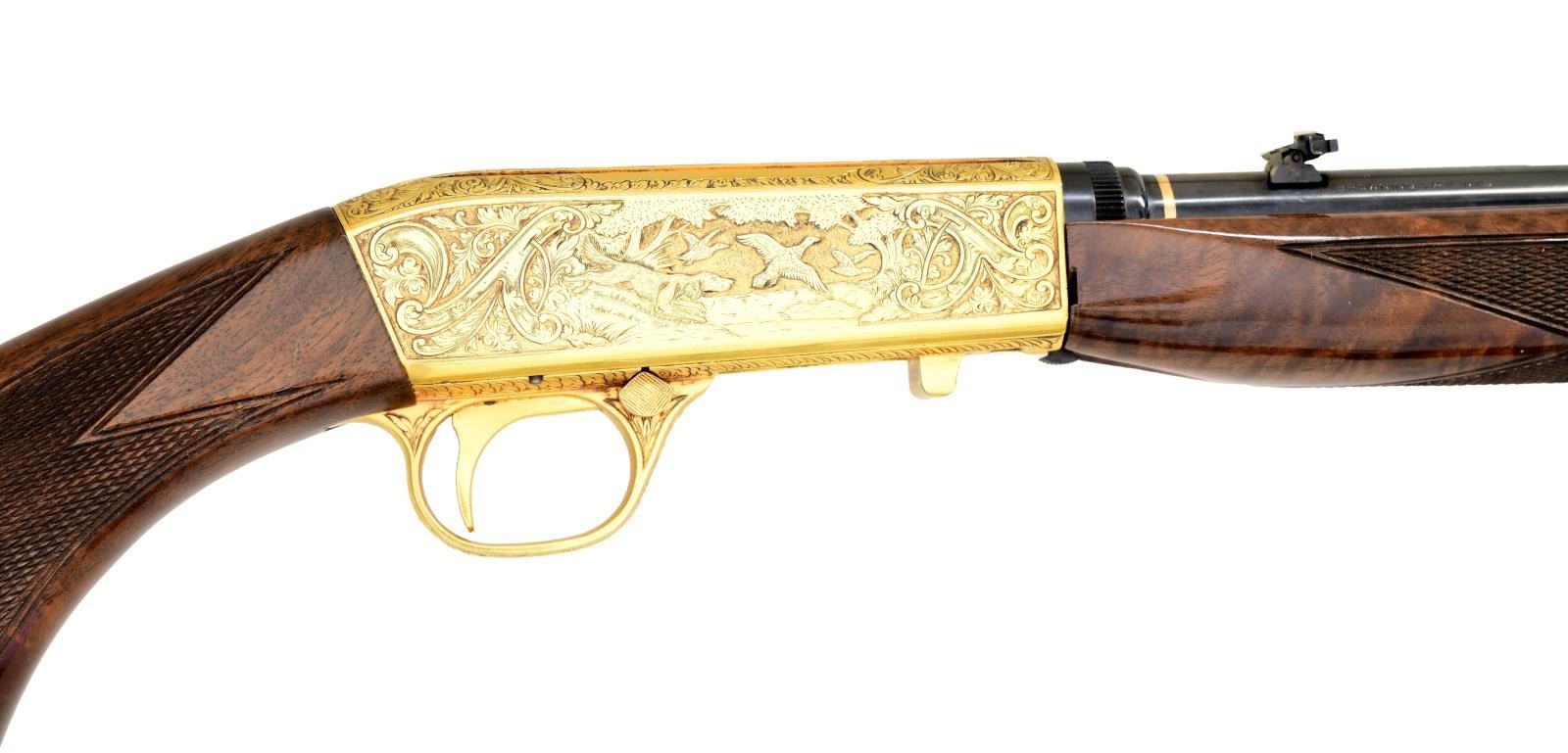 RIFLE. Cal. 22 LR. S# 3T55408. Bbl. 19 1/2". Bead front sight w/ folding leaf rear sight and grooved receiver. Action is custom engraved by Master Engraver Neil Hartliep. The late Neil Hartliep was a self taught engraver, guest instructor at Trinidad Colorado State college beginning in 1979 and later instructed with the NRA Gunsmithing Schools Program. In 1985 he was the author of "The Basics of Firearm Engraving", an NRA Education and Training Publication. The gold finished action features a setter and flying mallards on the right side with a setter and flushing pheasants on the left side. Scenes are surrounded by decorative banners and foliate highlights with stippled backgrounds. Complimentary engraving extends to upper and lower action areas. Breech and muzzle ends of the barrel are highlighted by gold bands. Trim beavertail forearm and pistol grip stock of gloss finished checkered fancy walnut with steel buttplate. Tubular mag. inserts through buttplate and loads on right side of stock. Mfg. in Belgium 1963. CONDITION: near excellent as upgraded. Receiver shows small marks on lower edges. Stocks have very good original finish showing small marks. Bright near excellent bore. (24-1983/DS). CURIO. $4,000-6,000.