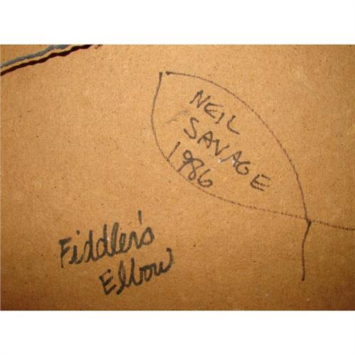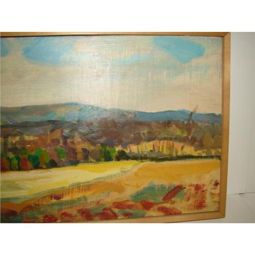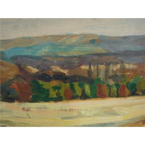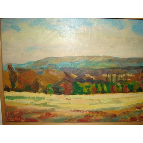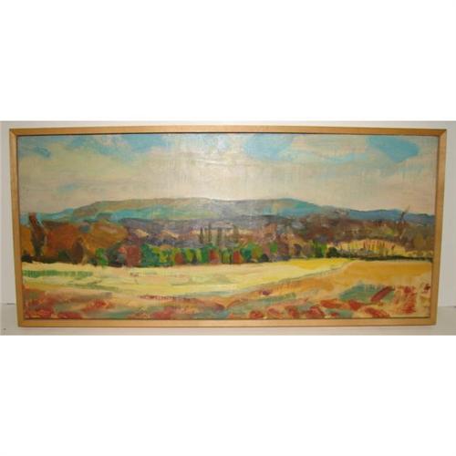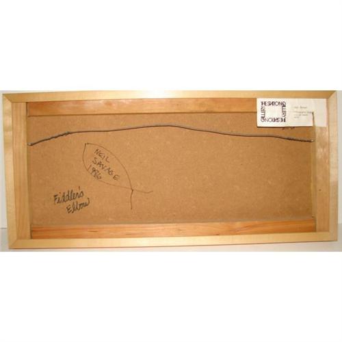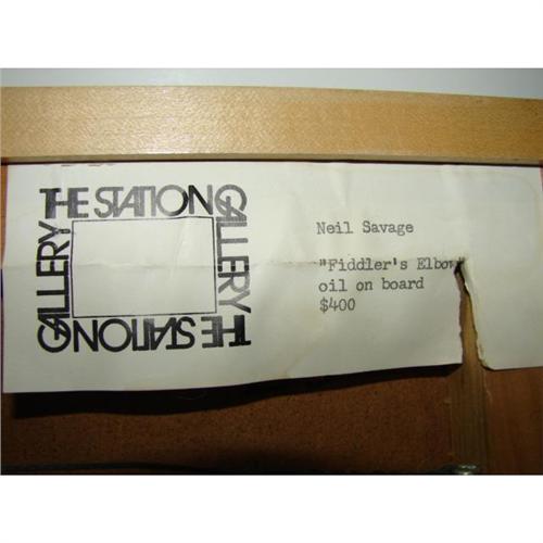 NEIL SAVAGE (AMERICAN, 20TH CENTURY) OIL ON BOARD PAINTING. ‘Fiddler’s Elbow’. Depicts a landscape scene with a mountainous background. Script on verso reads “Neil Savage/1986/Fiddler’s Elbow”. Retains gallery label on verso from The Station Gallery, Greenville, Delaware. 9.25” x 21.5”. Frame: 10.5” x 22.75”.