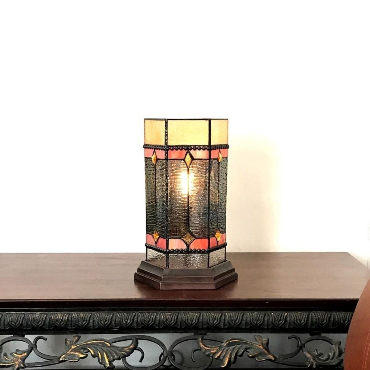 This Tiffany style 2-light table lamp features a dark antique bronze finish that will complement many decors throughout your home. Hand crafted from over 45 pieces of art glass and 12 beads that will add color and beauty to any space. Main colors are cream and green. Handcrafted using the same techniques that were developed by Louis Comfort Tiffany in the early 1900s, this beautiful Tiffany-style piece contains hand-cut pieces of stained glass, each wrapped in fine copper foil. Net Weight (lbs)5 lbs Overall Height14" Shade Width9" Shade Height12" Base Width9" Threaded Pipe/Finial LengthN/A Light DirectionUplight Electric Wire Length72 lbs Shade ShapeHexagon Shade MaterialsTiffany-glass Glass Thickness0.12" Est. Glass Cuts48pcs glass cut Est. Glass Beads12 glass beads Light Bulb Types(2) 40 Watt max E12 Type C Bulb (not included) FinishDark Antique Bronze Overall MaterialsGlass, resin, metal & electrical components Power SourceCorded-Electric, Wall Plug Switch TypeOn-line switch Specific UsesIndoor Base Height2"