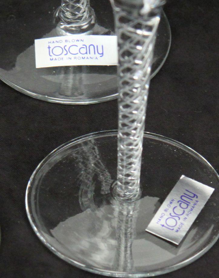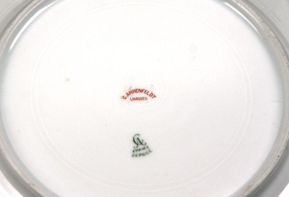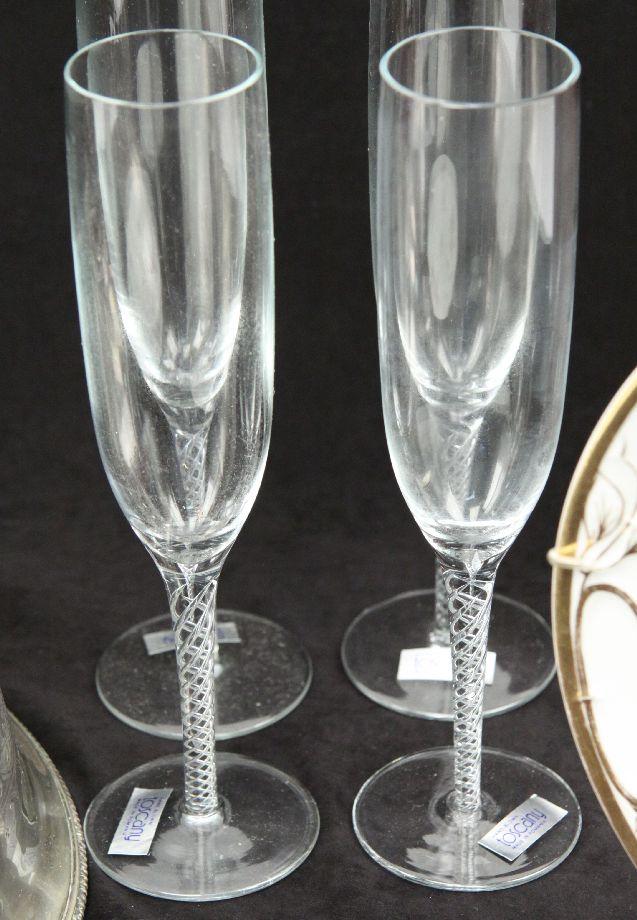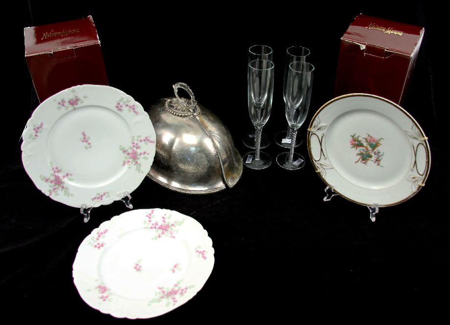 Lot containing (8) 8oz Neiman Marcus champagne flutes with original boxes, a 9.5 inch decorative Haviland plate, (2) 10 inch Limoges floral dinner plates, and a soldered silver plated dome platter cover converted to a light sconce. Overall very good condition.