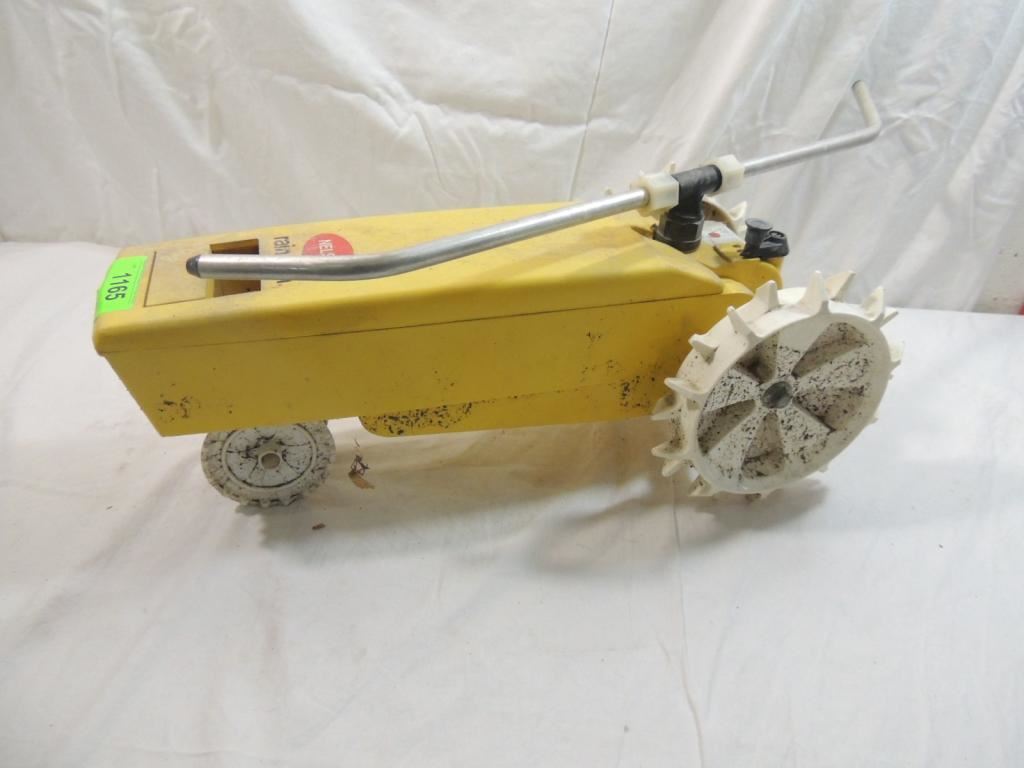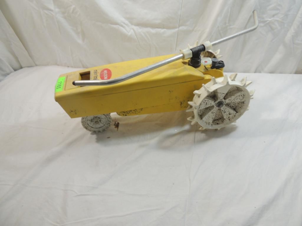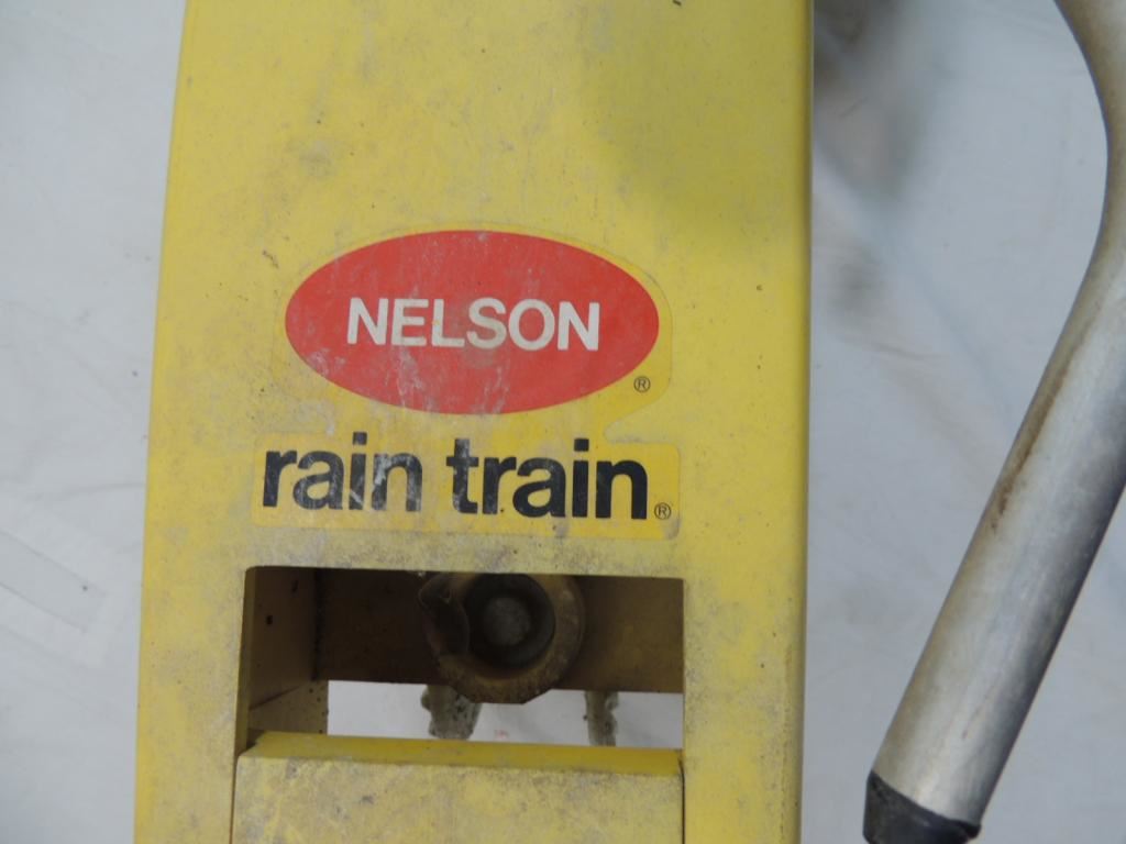 NELSON RAIN TRAIN SPRINKLER, TRAVELING SPRINKLER, HEAVY DUTY SPRINKLER, TRAVEL SPRINKLER, LAWN EQUIPMENT, YARD EQUIPMENT, GARDEN EQUIPMENT AS SHOWN SEE PHOTO FOR MORE DETAILS.