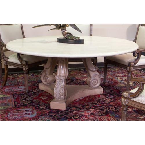 DINING TABLE: Neo Classical style diinning table, heavy marble top, carved legs on platform. 31''h x 72''diameter