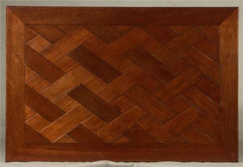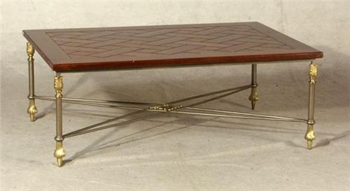 COFFEE TABLE: Neo Classical style coffee table, parquetry top, gilt and brushed nickel legs and stretcher. 20''h x 34''d x 51''w