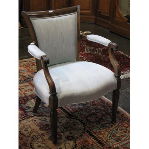 ARMCHAIR: Neo classical style walnut armchair, molded frame, tapered legs, powder blue upholstery.
