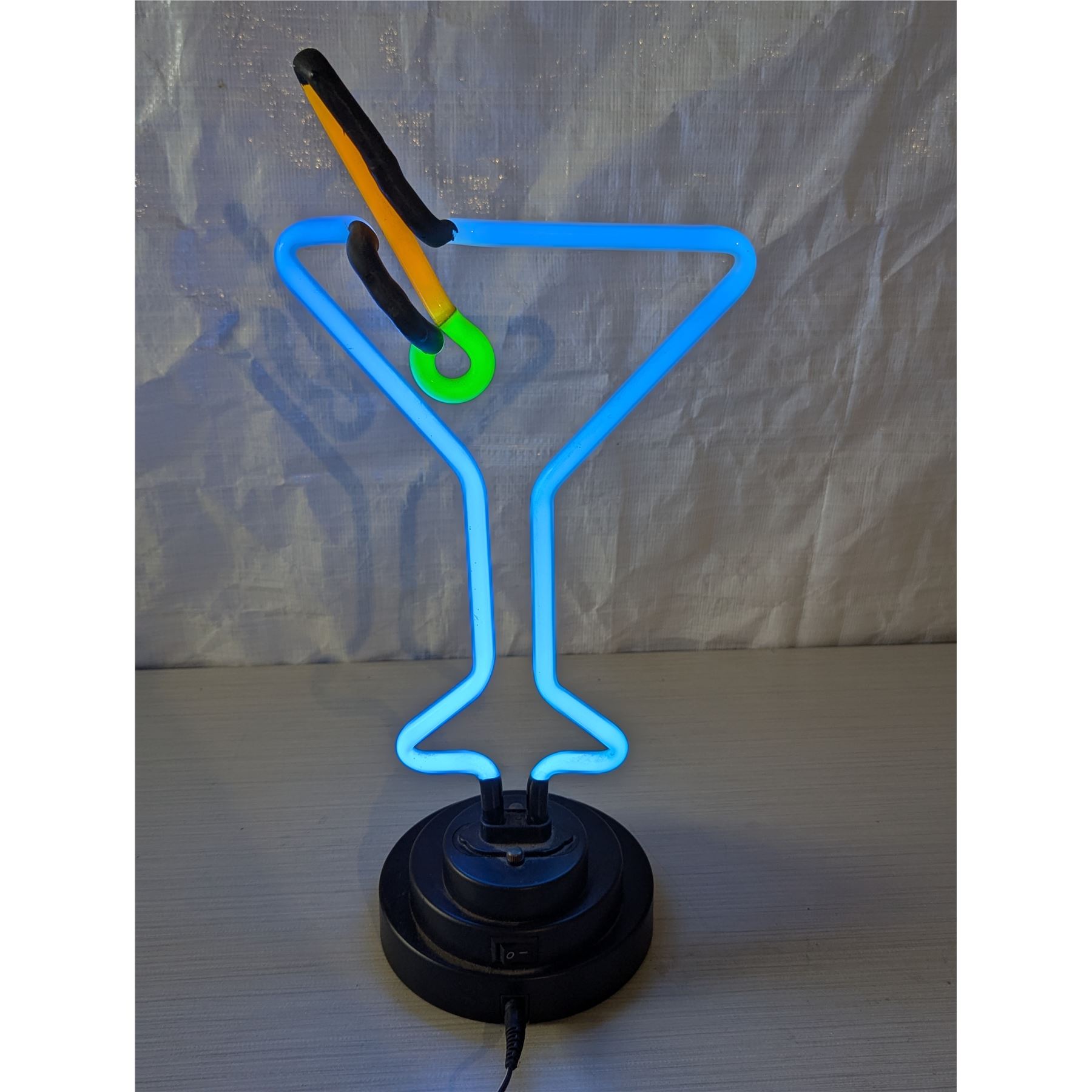 As Alan Jackson says, "It's five-o-clock somewhere". Stands 17" high with 5.25" diameter base. Off on switch on the back, with appropriate charge adapter. Light up your life, man case or your Madmen office:)