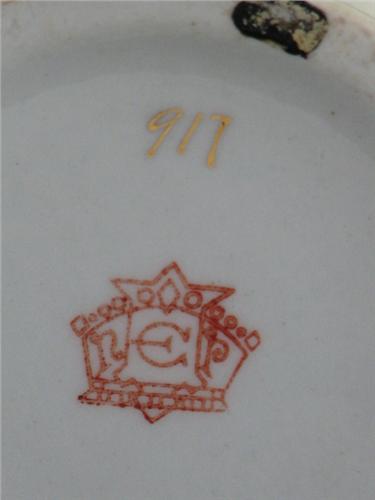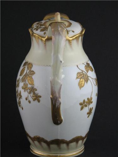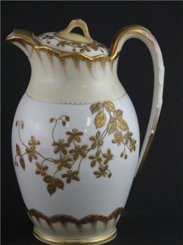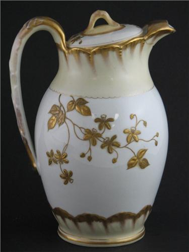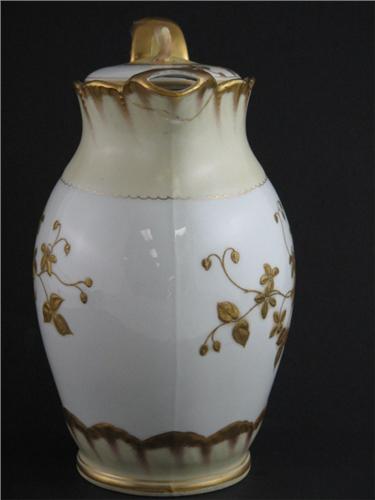 Ca. 1889-1895, Chocolate Pot with Lid. Features, Semi-porcelain, White ground with gold lustre decoration, Cream border at tops and bottoms, Vinous floral motif in between borders in cream and gold leaf, stylized branch handle. Marked: "NEP" crown and shie