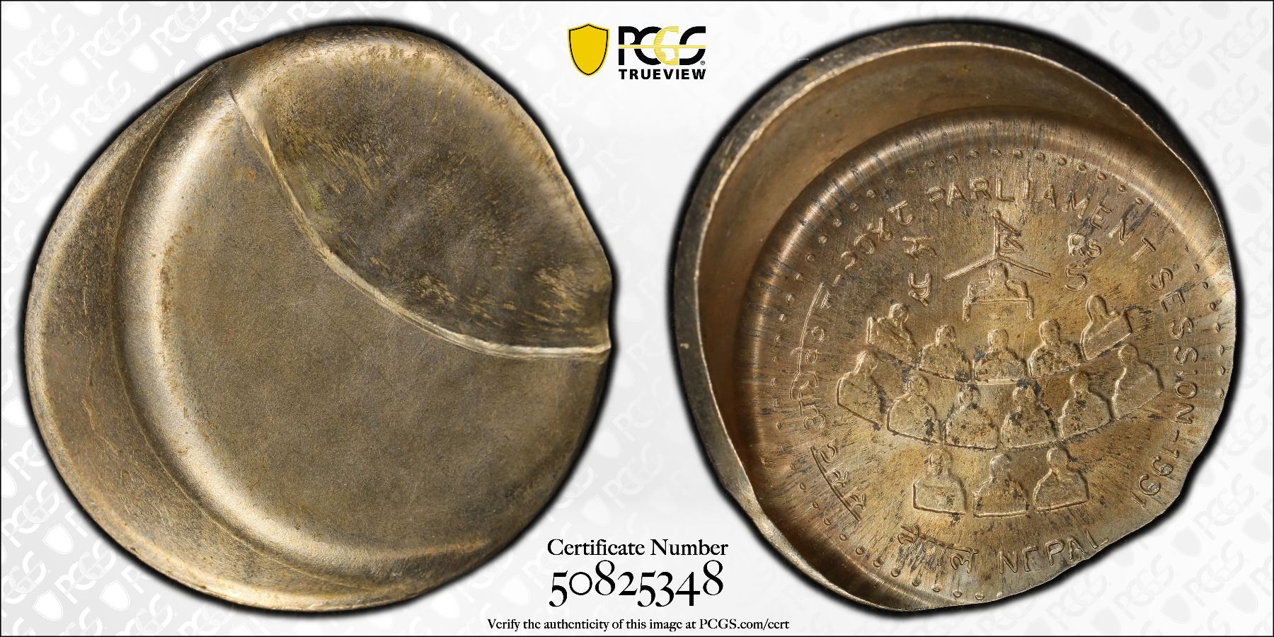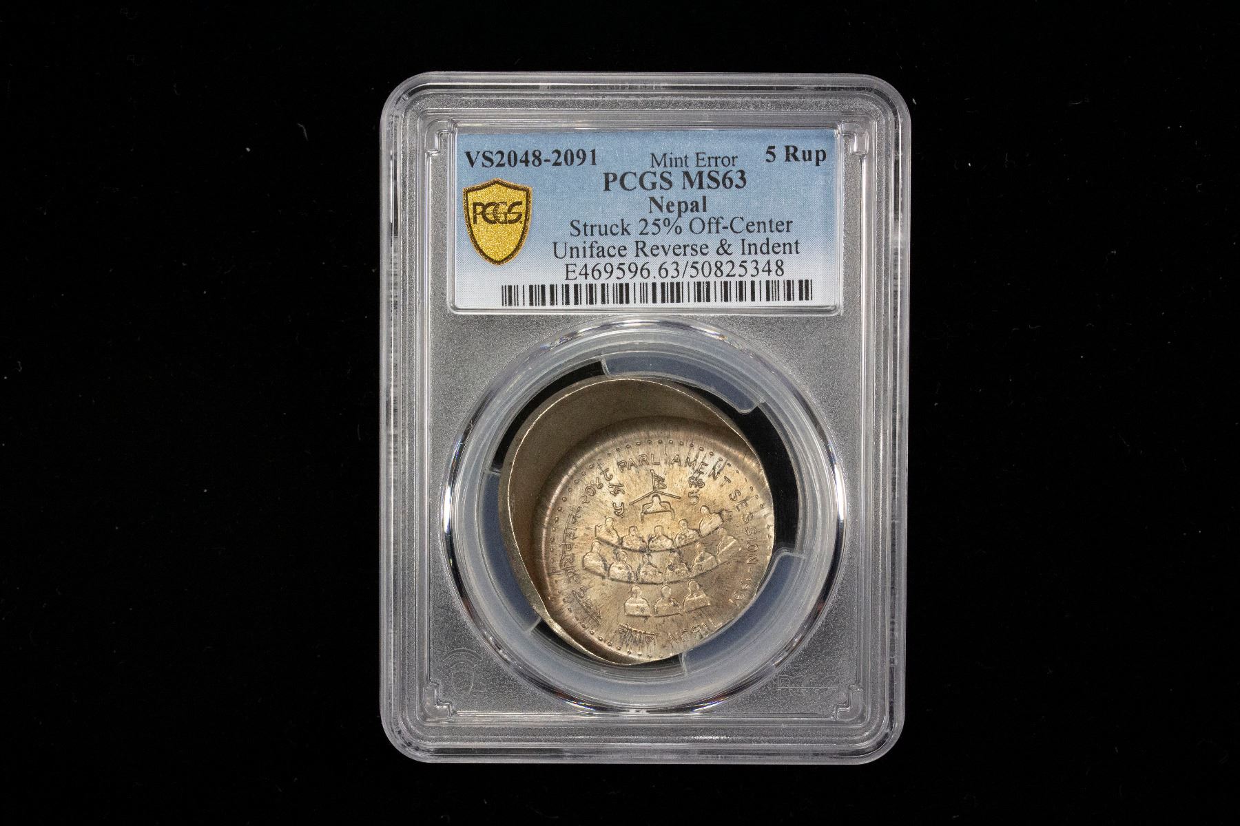 NEPAL: Birendra Bir Bikram, 1972-2001, 5 rupees, VS2048 (1991), KM-1062, Parliament Session, variety with the 5 beneath the R of Rs, struck 25% off center, uniface reverse and indentation, a lovely lustrous mint state example! PCGS graded MS63 Mint Error.