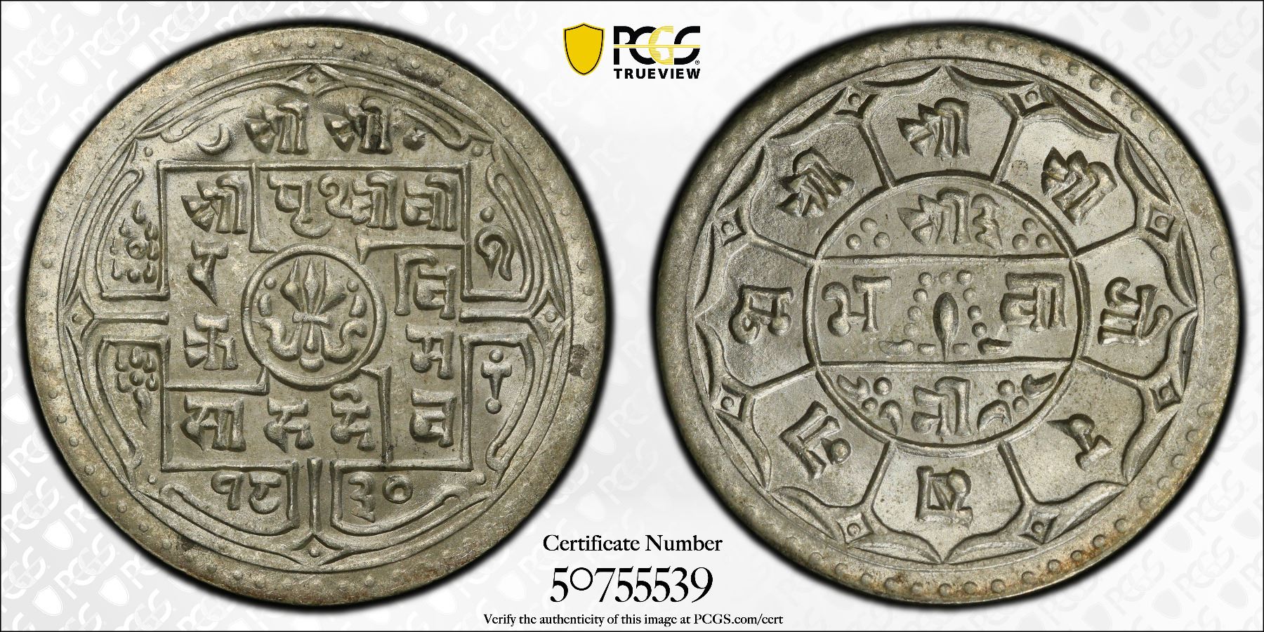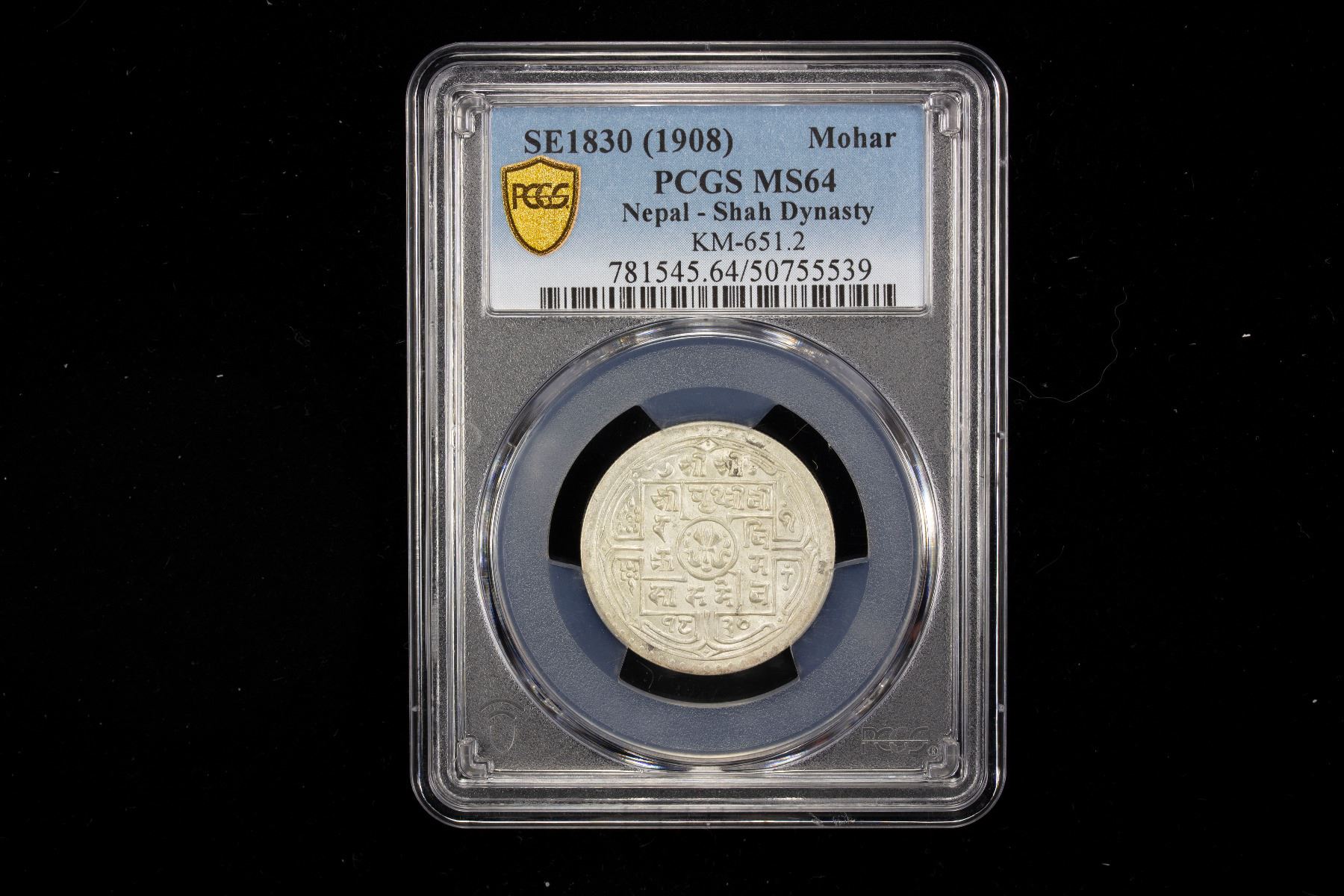 NEPAL: Prithvi Bir Bikram, 1881-1911, AR mohar, SE1830 (1908), KM-651.2, Shah Dynasty, a wonderful lustrous mint state example! PCGS graded MS64.