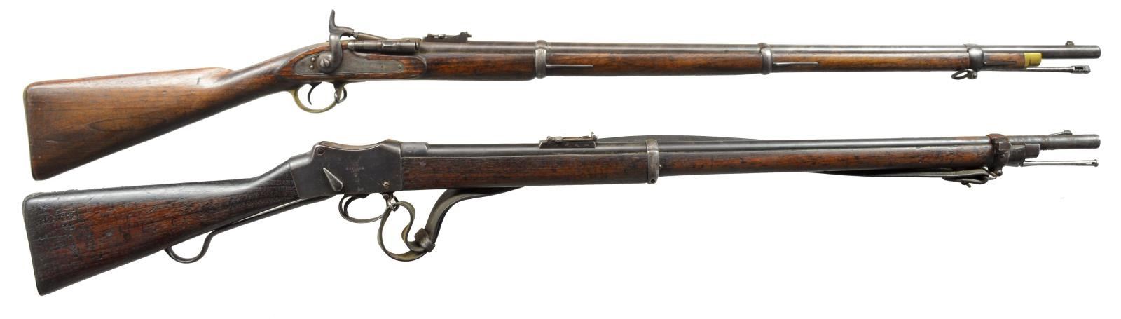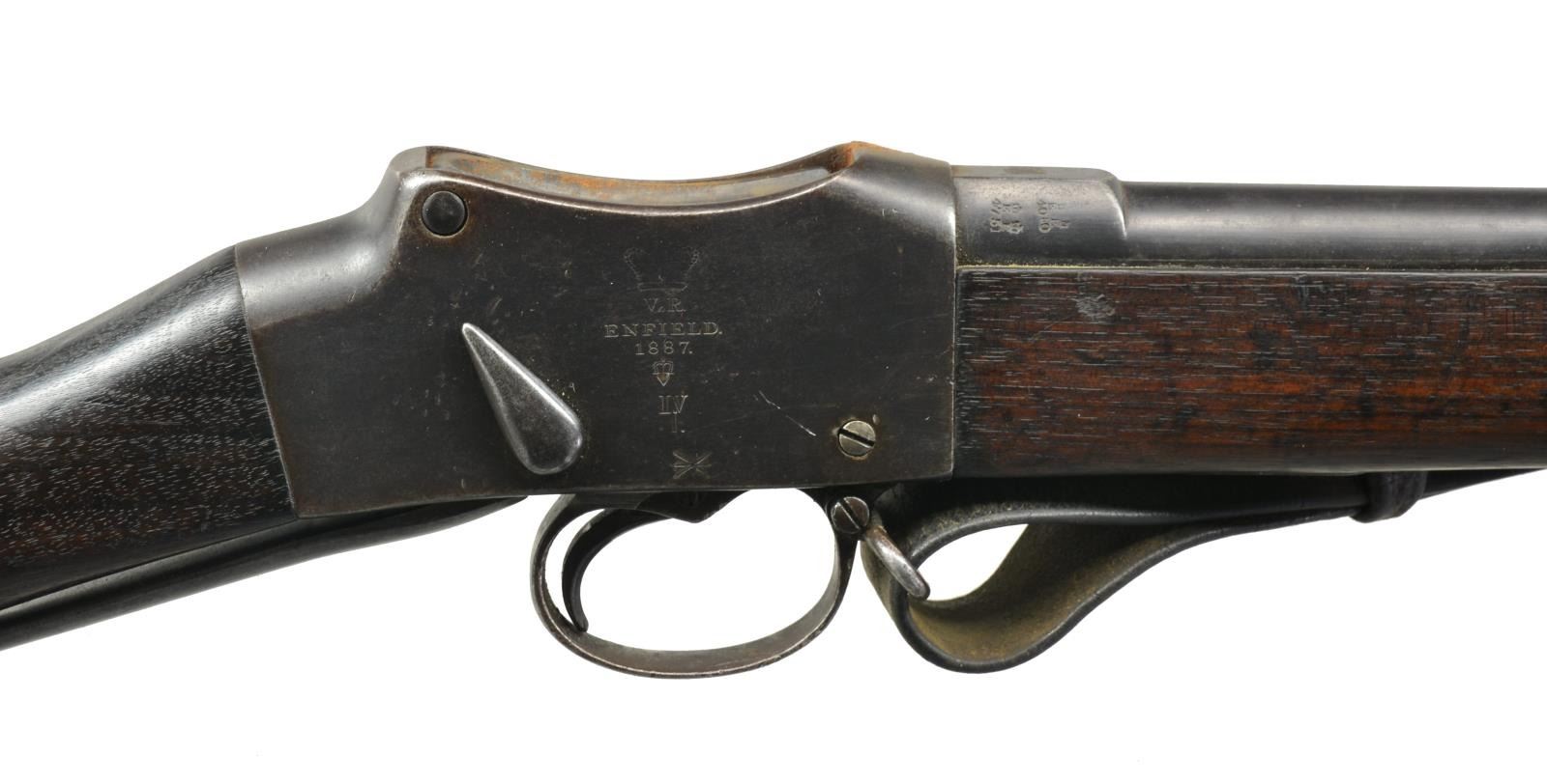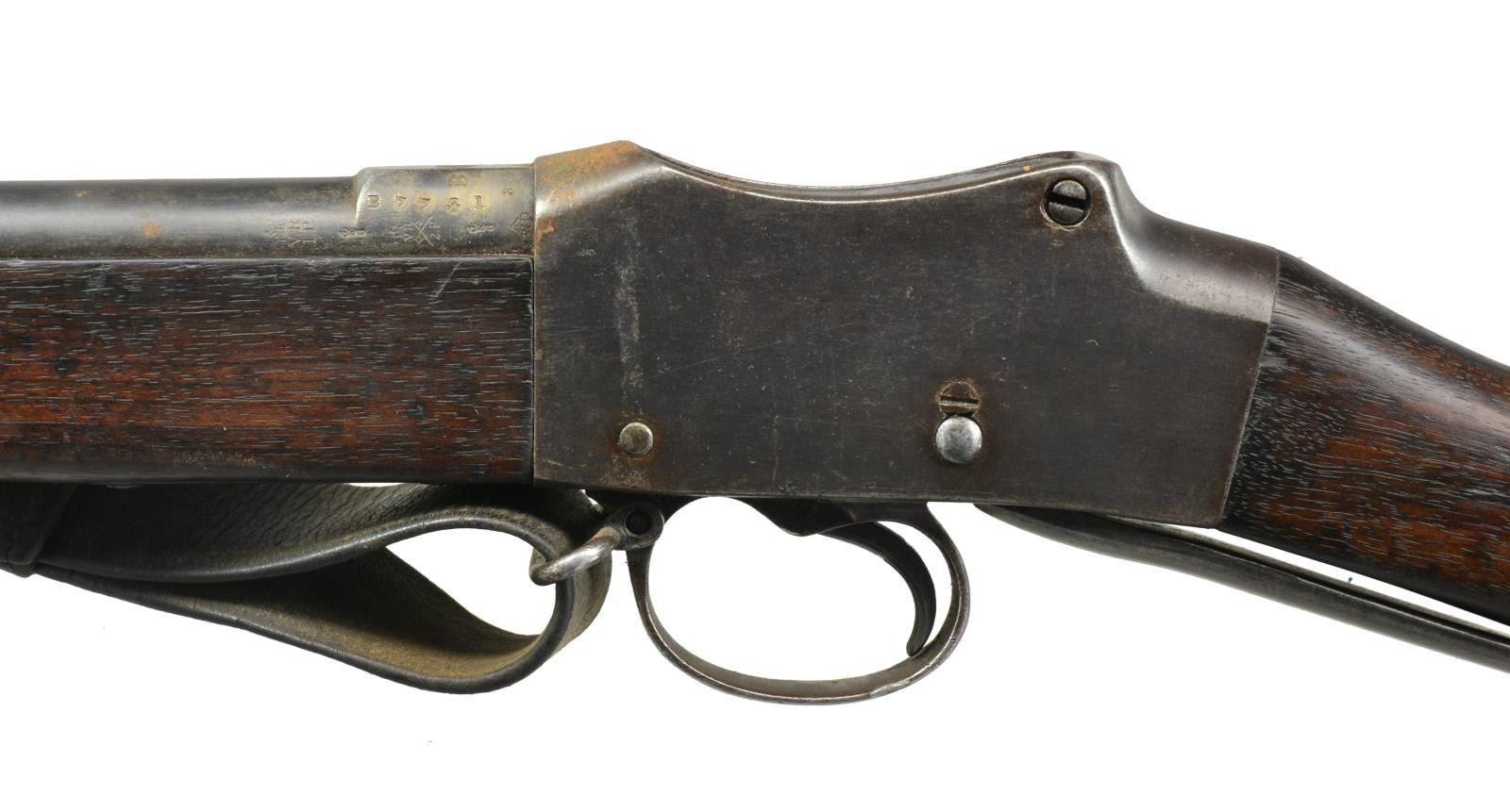 SINGLE SHOT RIFLES. 1) NEPALESE MARKED ENFIELD PATTERN SNIDER CONVERSION RIFLE. Cal. 577 Snider. NSN. Bbl. 36 3/4". Blade front sight w/ graduated leaf rear sight. Snider style conversion action, breech blocks pivots to the right for loading. Unmarked lock. 3 Band walnut replacement stock. Brass fittings include buttplate, trigger guard, nosecap & side plate escutcheons. Top tang, breech block, buttplate & trigger guard have Nepalese markings. CONDITION: metal has faded to light gray patina. Stock shows numerous dents & handling marks w/ sm. chips & cracks in tang, lock & trigger guard areas. Bore is generally bright retaining sound rifling. (01-18439/DS). 2) ENFIELD MARK IV MARTINI HENRY RIFLE. Cal. .577-450. S# B7731. Bbl. 33". Ramp mounted blade front sight w/ graduated folding leaf rear sight. Right side bayonet lug on front band. Long lever. Action w/ cocking indicator on right side. 2 Band walnut forearm w/ cleaning rod. Straight grip walnut stock w/ steel buttplate. Right side of stock has numerous British & Nepalese markings. Top bbl. flat is stamped "F" followed by apparent 6 point star. Leather sling on original swivels. CONDITION: 60% dull fading blue w/ an area of red rust at top of action. Wood has age darkened worn appearance w/ numerous dents & handling marks. Dark pitted bore. (01-18442/DS). ALL ANTIQUE. $500-800.