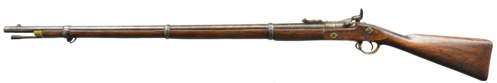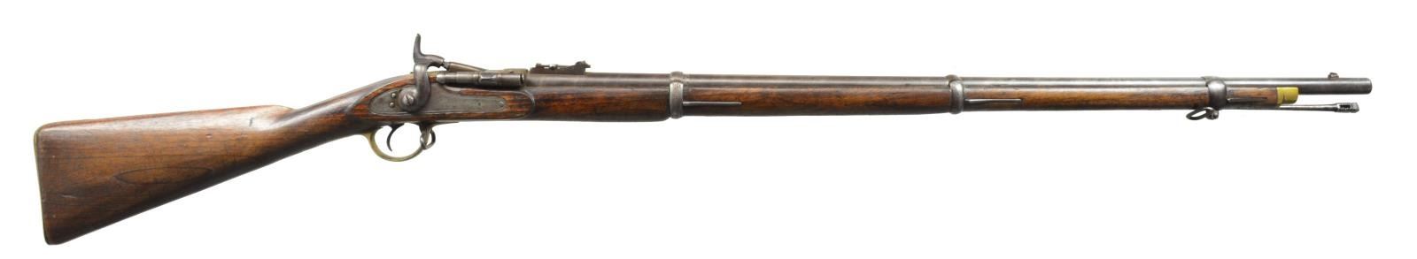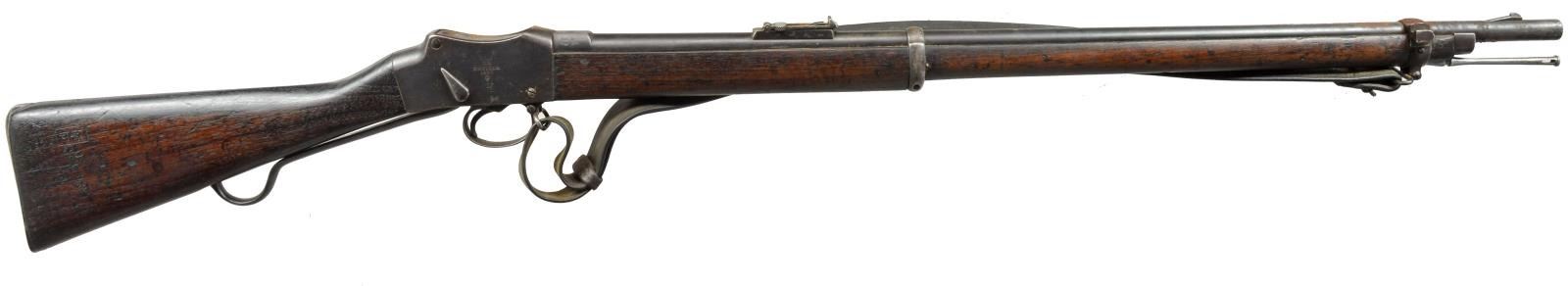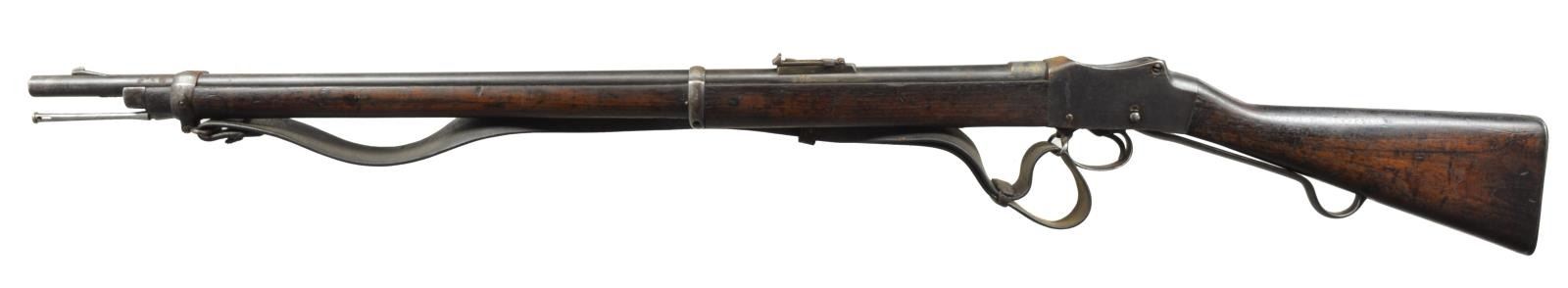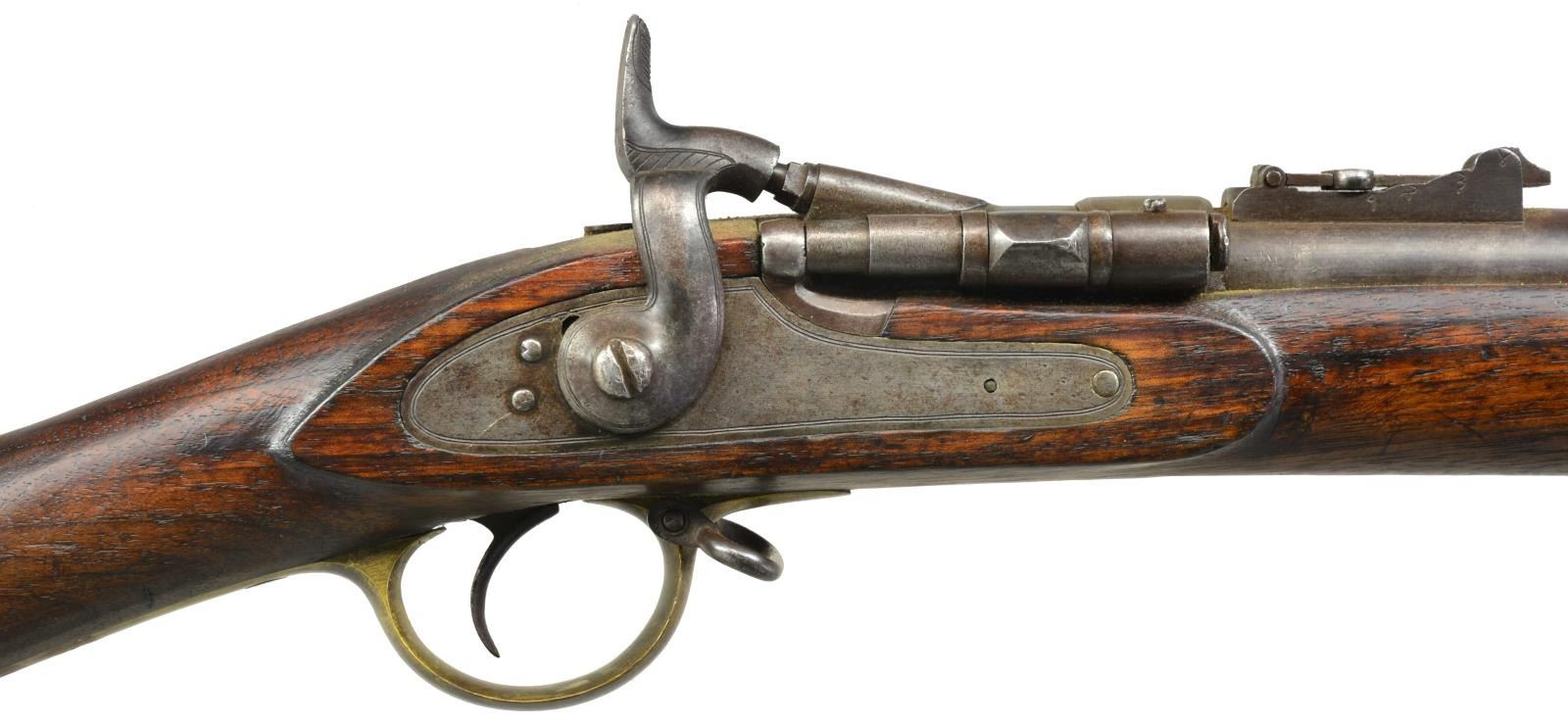 SINGLE SHOT RIFLES. 1) NEPALESE MARKED ENFIELD PATTERN SNIDER CONVERSION RIFLE. Cal. 577 Snider. NSN. Bbl. 36 3/4". Blade front sight w/ graduated leaf rear sight. Snider style conversion action, breech blocks pivots to the right for loading. Unmarked lock. 3 Band walnut replacement stock. Brass fittings include buttplate, trigger guard, nosecap & side plate escutcheons. Top tang, breech block, buttplate & trigger guard have Nepalese markings. CONDITION: metal has faded to light gray patina. Stock shows numerous dents & handling marks w/ sm. chips & cracks in tang, lock & trigger guard areas. Bore is generally bright retaining sound rifling. (01-18439/DS). 2) ENFIELD MARK IV MARTINI HENRY RIFLE. Cal. .577-450. S# B7731. Bbl. 33". Ramp mounted blade front sight w/ graduated folding leaf rear sight. Right side bayonet lug on front band. Long lever. Action w/ cocking indicator on right side. 2 Band walnut forearm w/ cleaning rod. Straight grip walnut stock w/ steel buttplate. Right side of stock has numerous British & Nepalese markings. Top bbl. flat is stamped "F" followed by apparent 6 point star. Leather sling on original swivels. CONDITION: 60% dull fading blue w/ an area of red rust at top of action. Wood has age darkened worn appearance w/ numerous dents & handling marks. Dark pitted bore. (01-18442/DS). ALL ANTIQUE. $500-800.