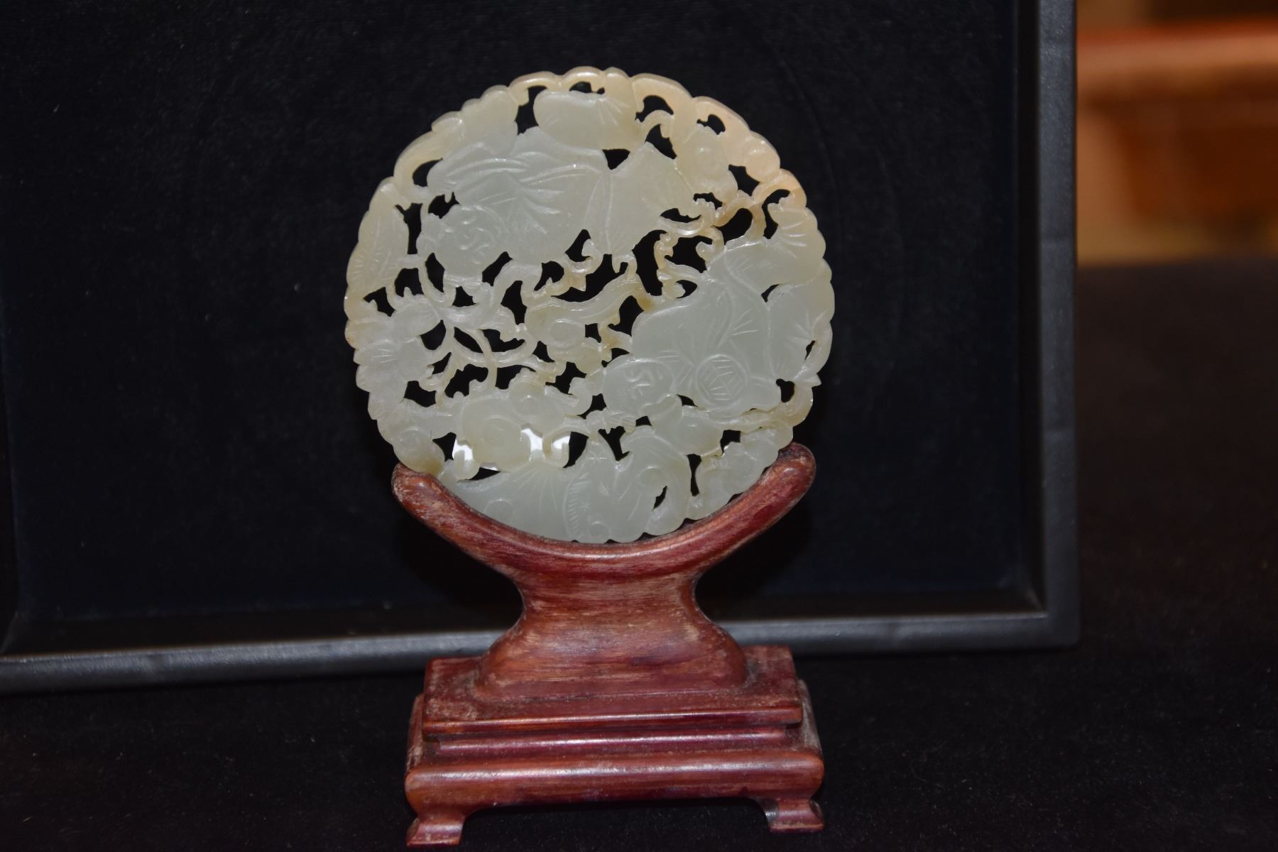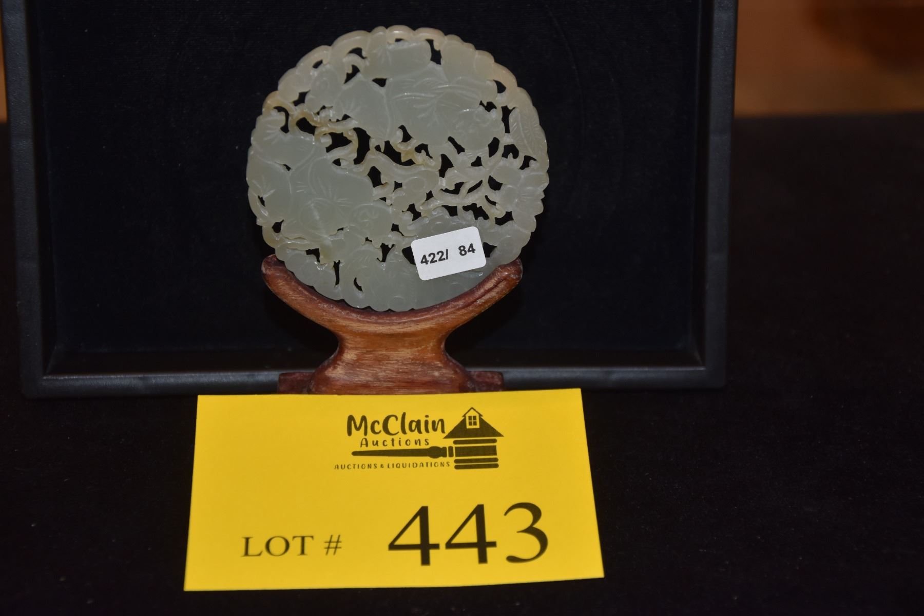 NEPHRITE FLORAL CARVED PLAQUE (ROUND) W/STAND