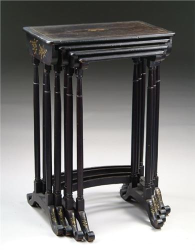 NESTING SET OF FOUR DECORATED LACQUERWARE STANDS. Graduated set. Each with black lacquer finish and gold floral and leaf highlights. Label of T. G. Buckley Co. Boston on bottom of one stand. Each stand signed with Oriental character on base of leg. SIZE: Tops are 19-1/2in. x 12in.. Two are 12-1/2in. x 10in.. 28in. h to 26in. h. CONDITION: Four feet have old repairs, otherwise good. 9-26053