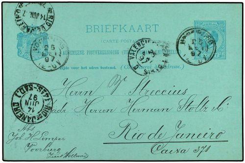 1897 5 c. Blue stationery card used to RIO DE JANEIRO cancelled by VOORBURG despatch cds, with VALENCIENNES a PARIS TPO and RIO DE JANEIRO arrival cds´s. Scarce destination.