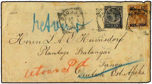 1904 (June 25) Cover from PADANG to TANGA franked by 1902 10 c. slate and 1900 15 c. on 15 c. yellow brown tied by PADANG squared circle and backstamped with NI AGENT SINGAPORE squared circle, BOMBAY, ADEN, ZANZIBAR andTANGA cds´s. On arrival marked returned and handstamped NON-RECLAME/NOT CLAIMED in black. Rare destination and an unusual cover. Scott 33, 48.