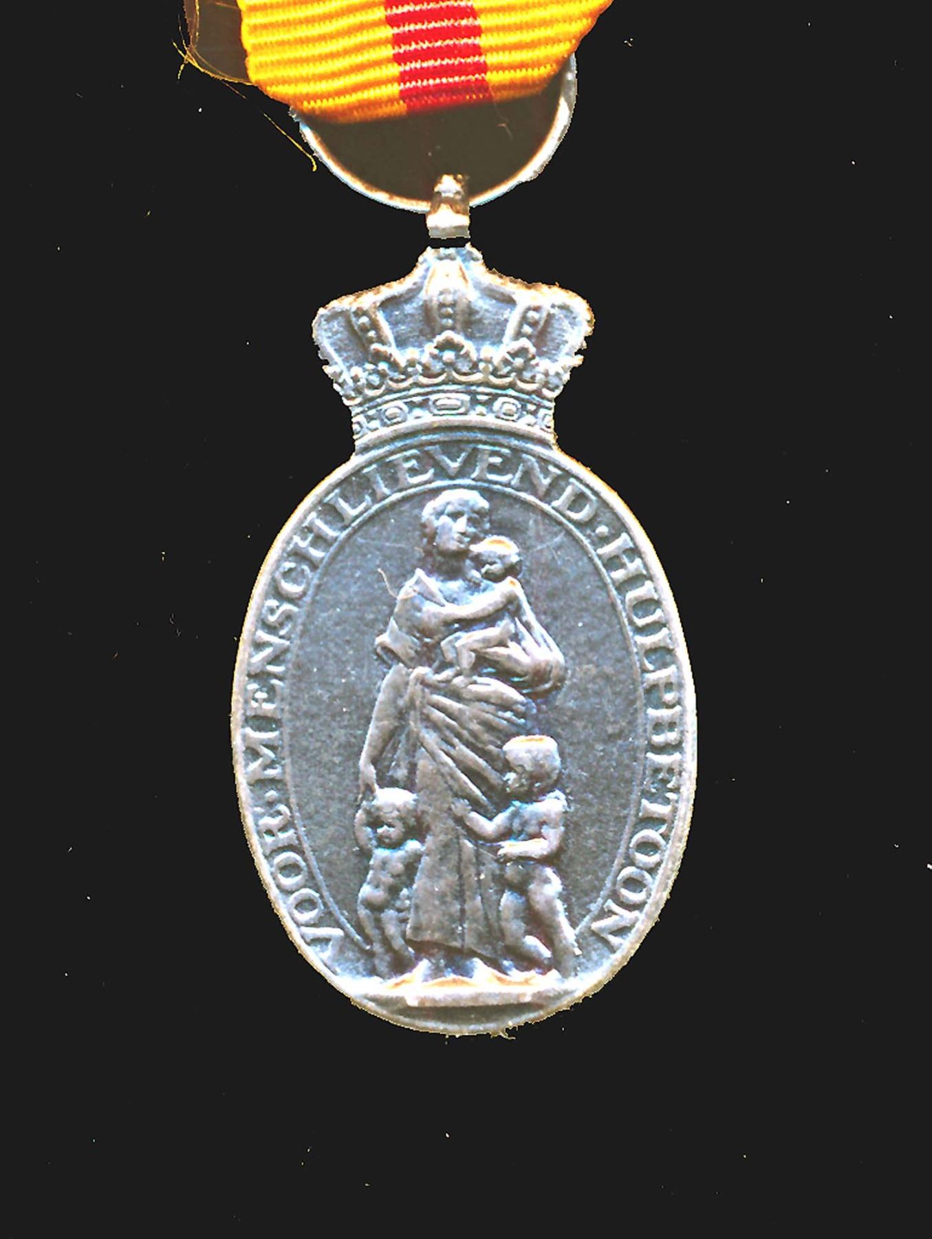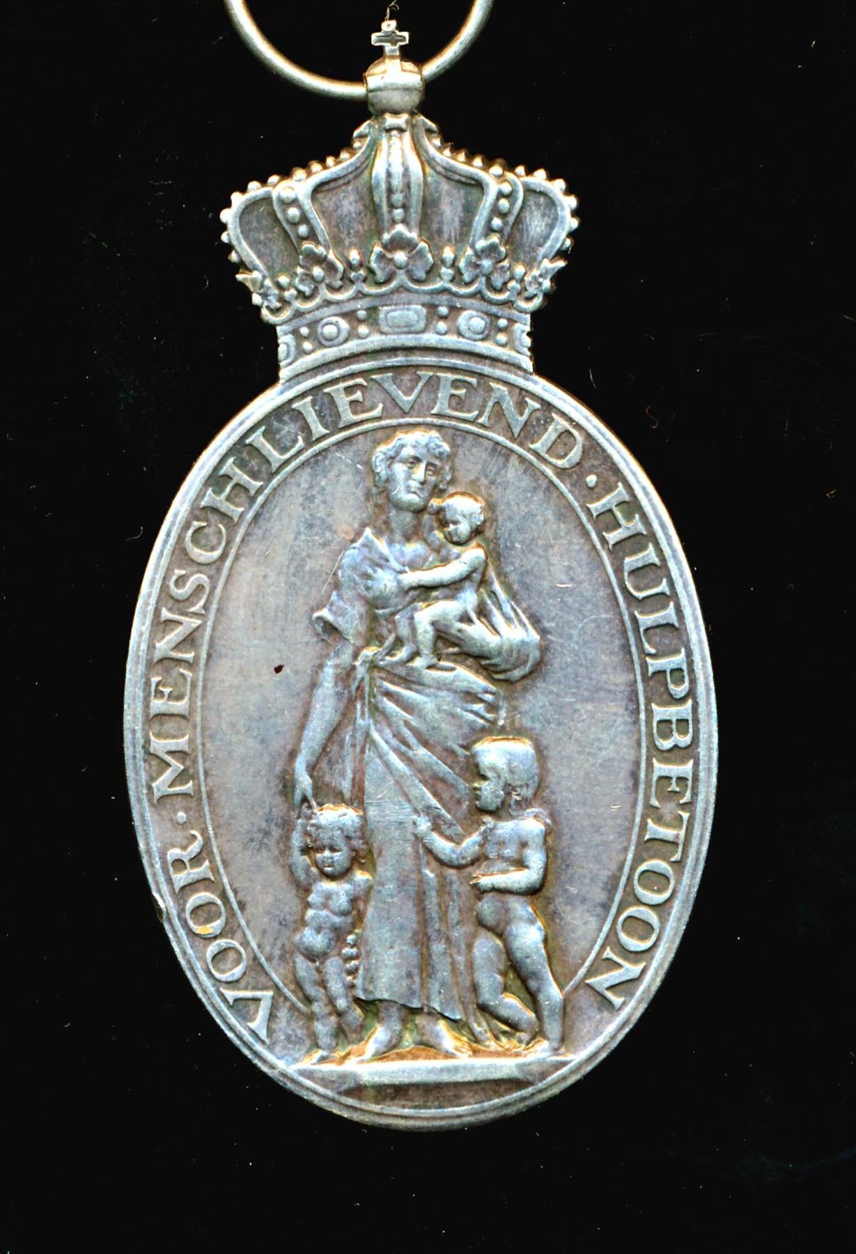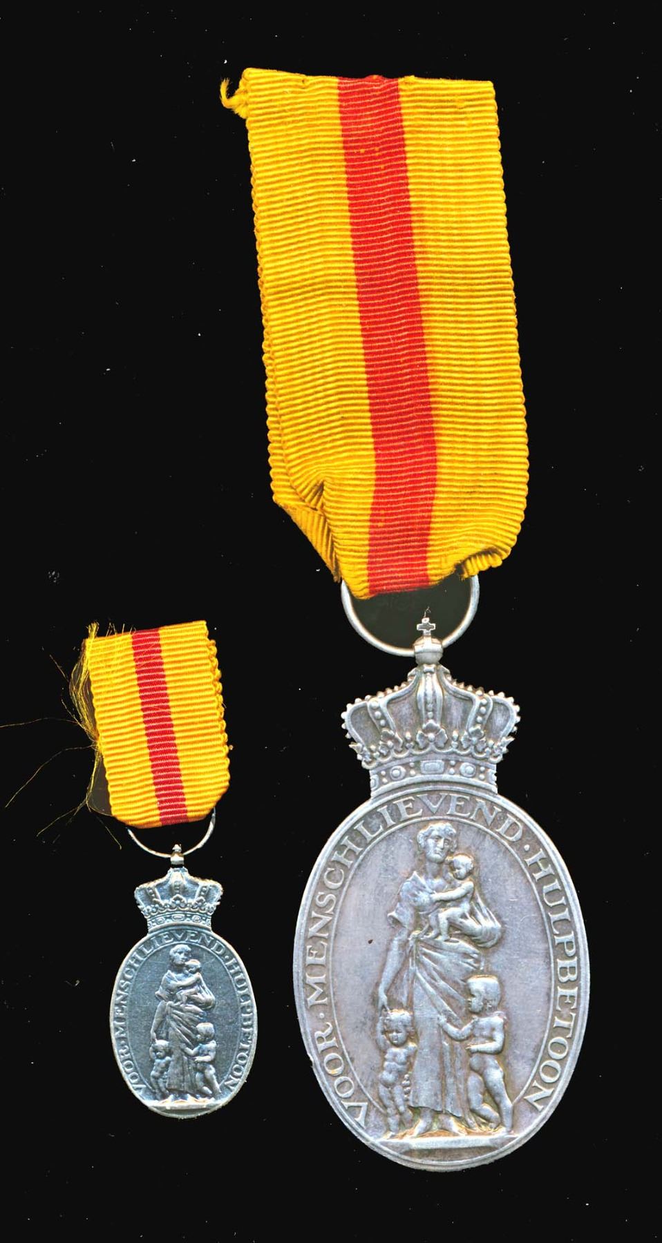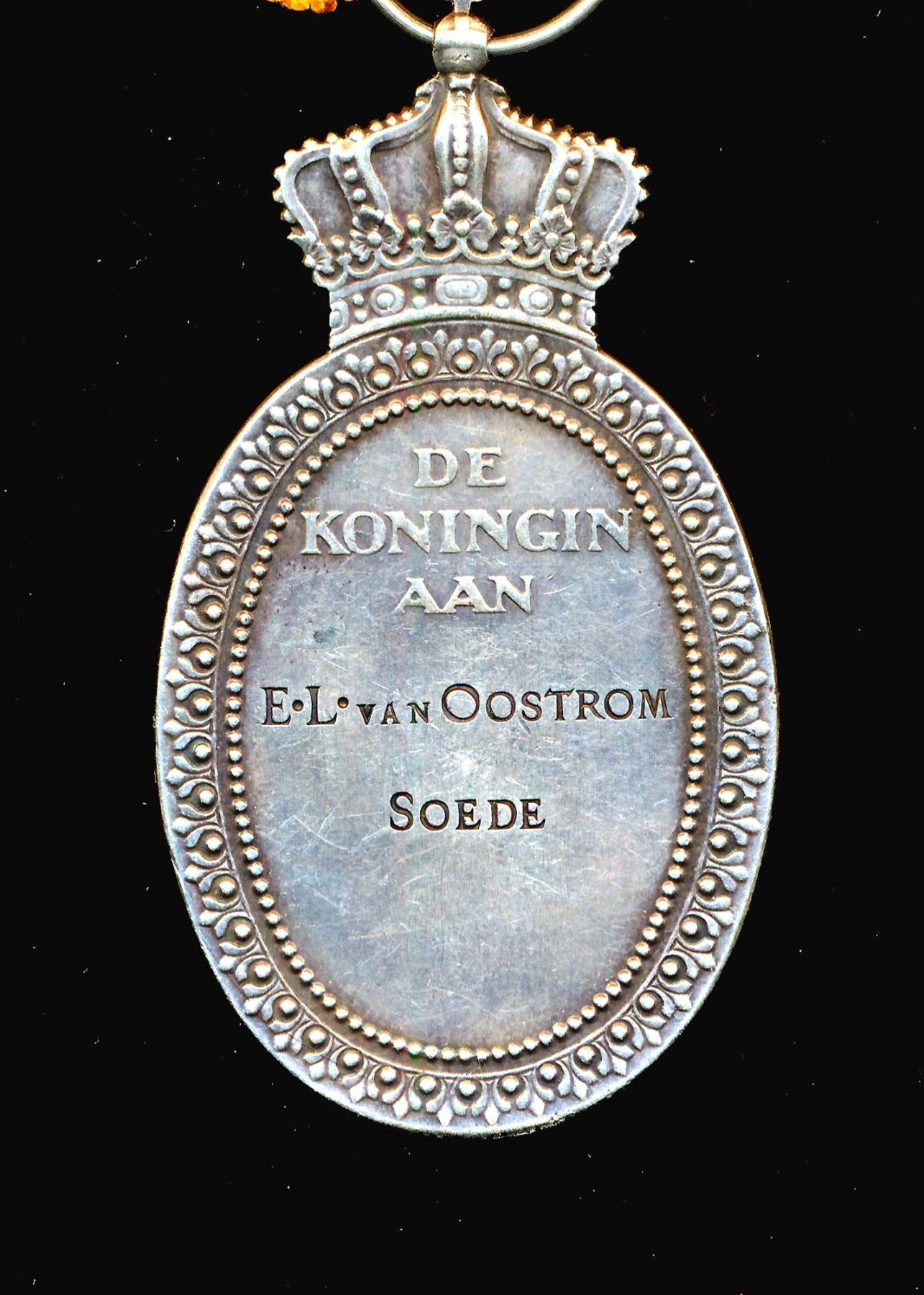 26.80 gms. silver "Voor.Menschlievend Hulpbetoon" Named E.L. van Oostrom Soede w/ribbon and a miniature. A scarce piece to have.