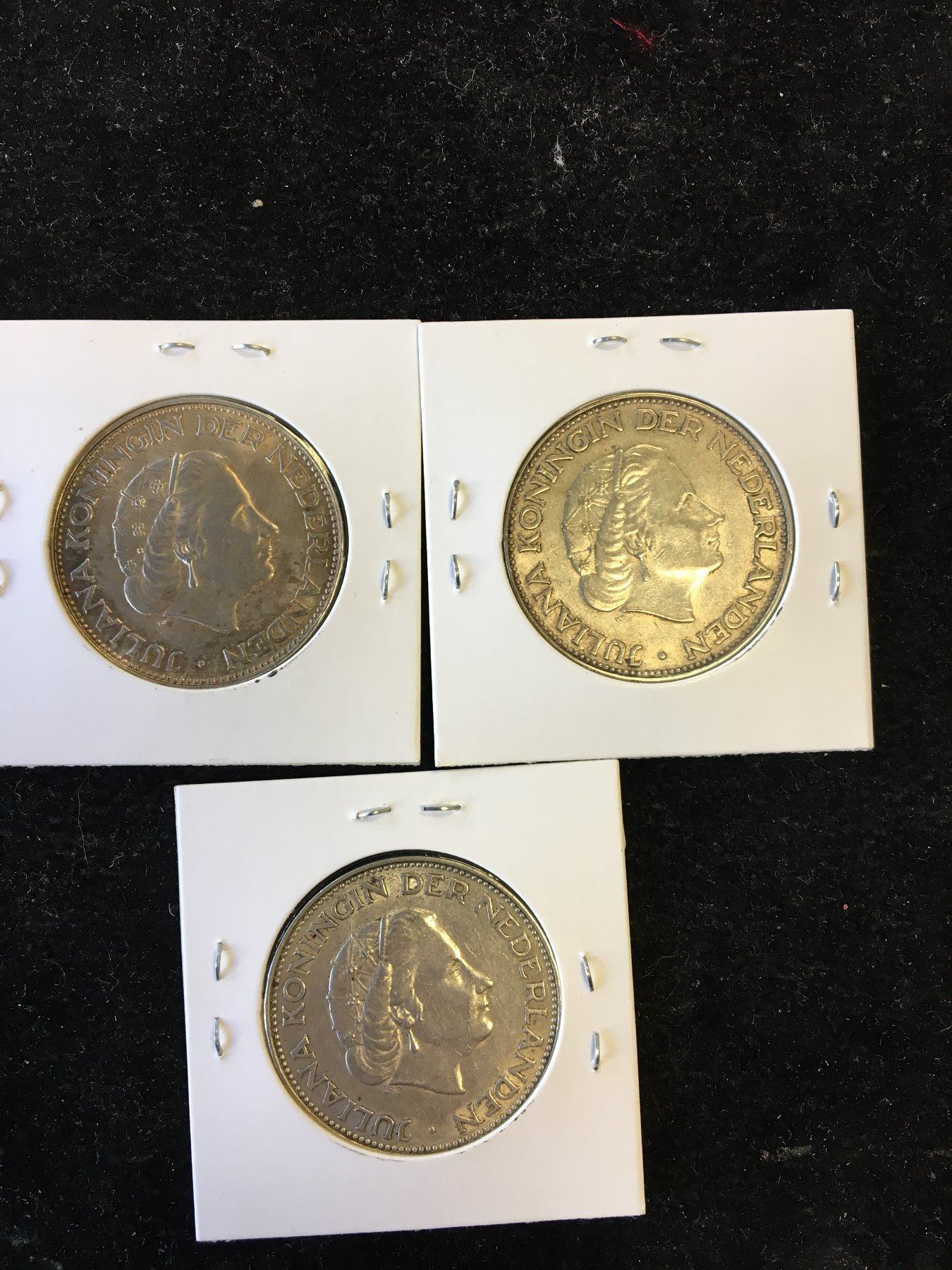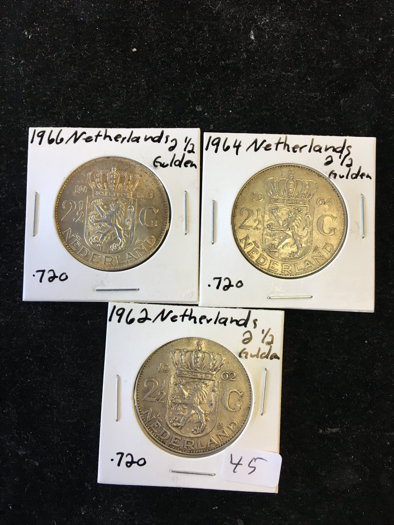 NICE LOT OF 3X 2 1/2 GULDEN SILVER COINS.1966,64 AND 62