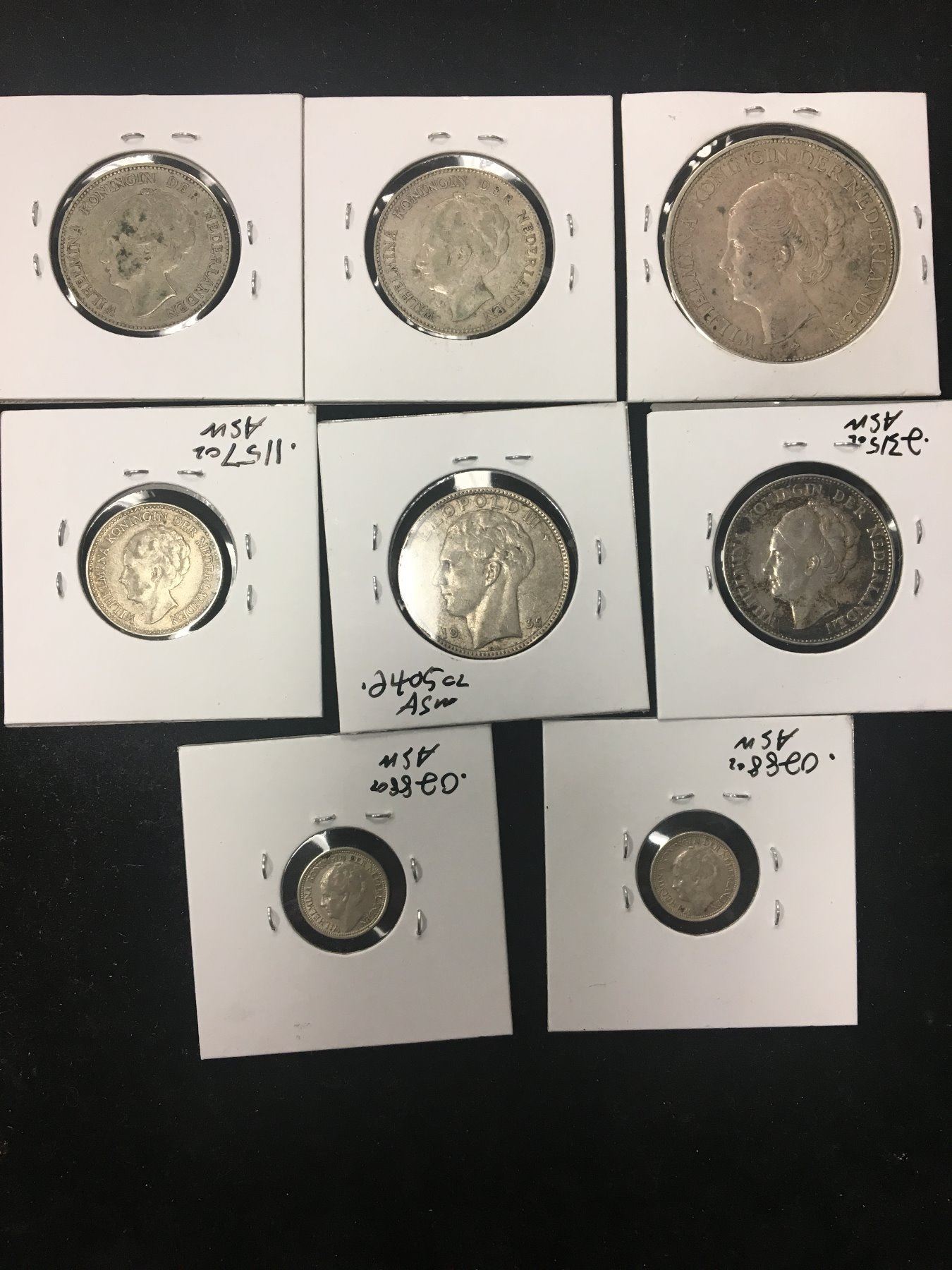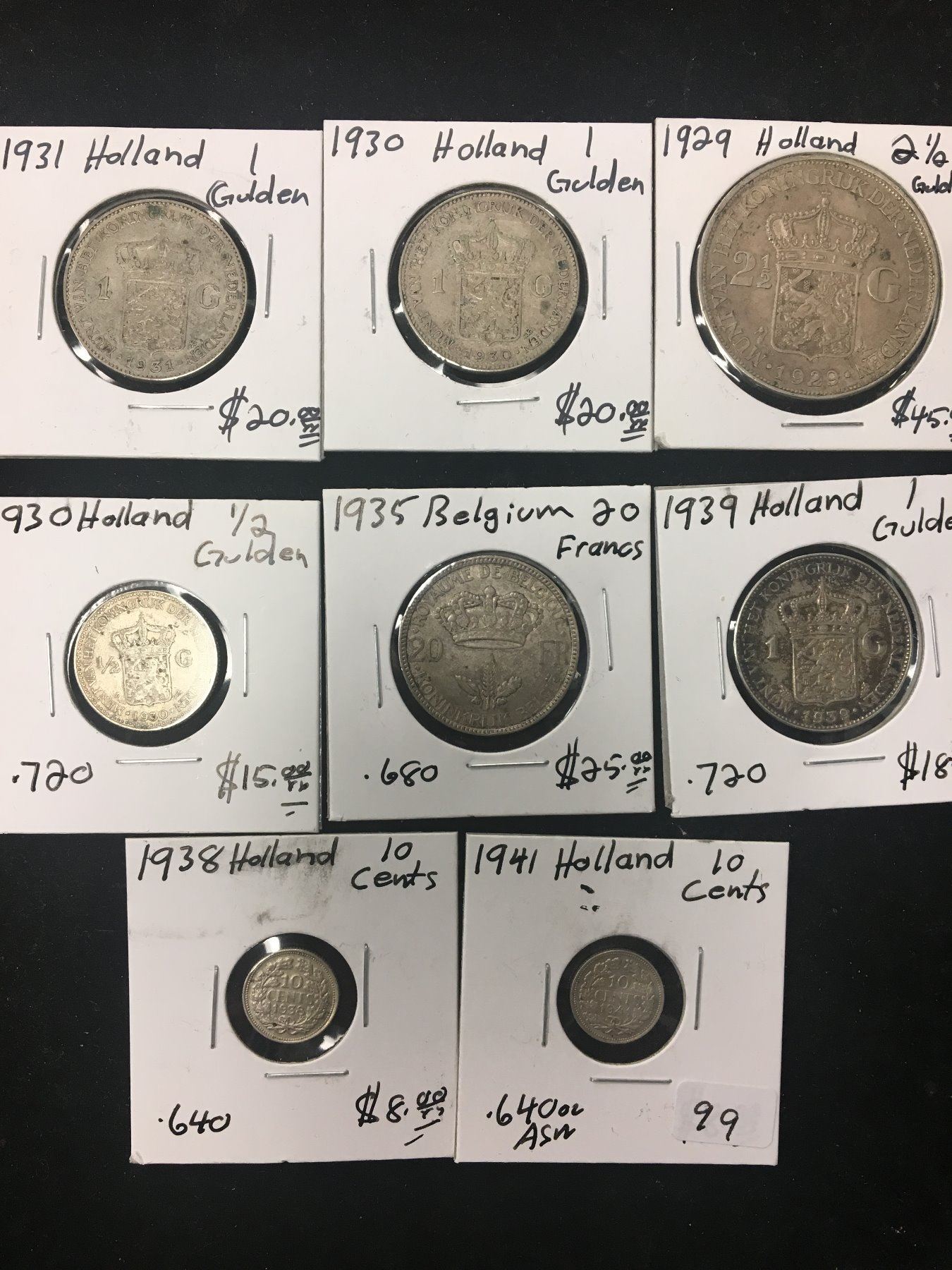 NICE LOT OF 8 SILVER COINS FROM THE NETHERLANDS! 1941 10 CENT,1938 10 CENT,1930,1/2 GULDEN,1935 BELGIUM 20 FRANCS,1939 1 GULDEN,1931 1 GULDEN,1930 1 GULDEN,1929 2 1/2 GULDEN!