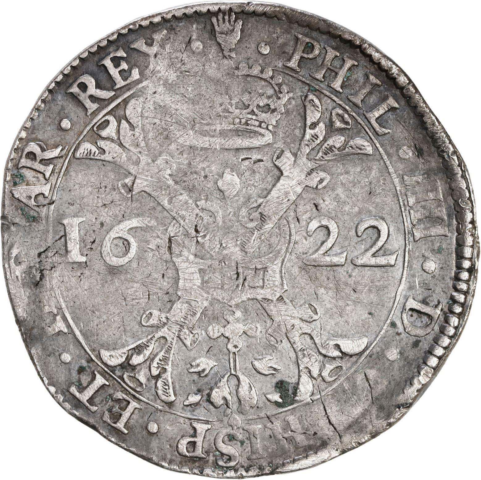 NETHERLANDS (Spanish), Brabant, Antwerp mint, patagon, Philip IV, 1622. Delm-295; Dav-4462; KM-53.3. 27.60 grams. XF with scratches in the centers, bold date, some verdigris spots, a few flat areas and irregular edges as is typical.