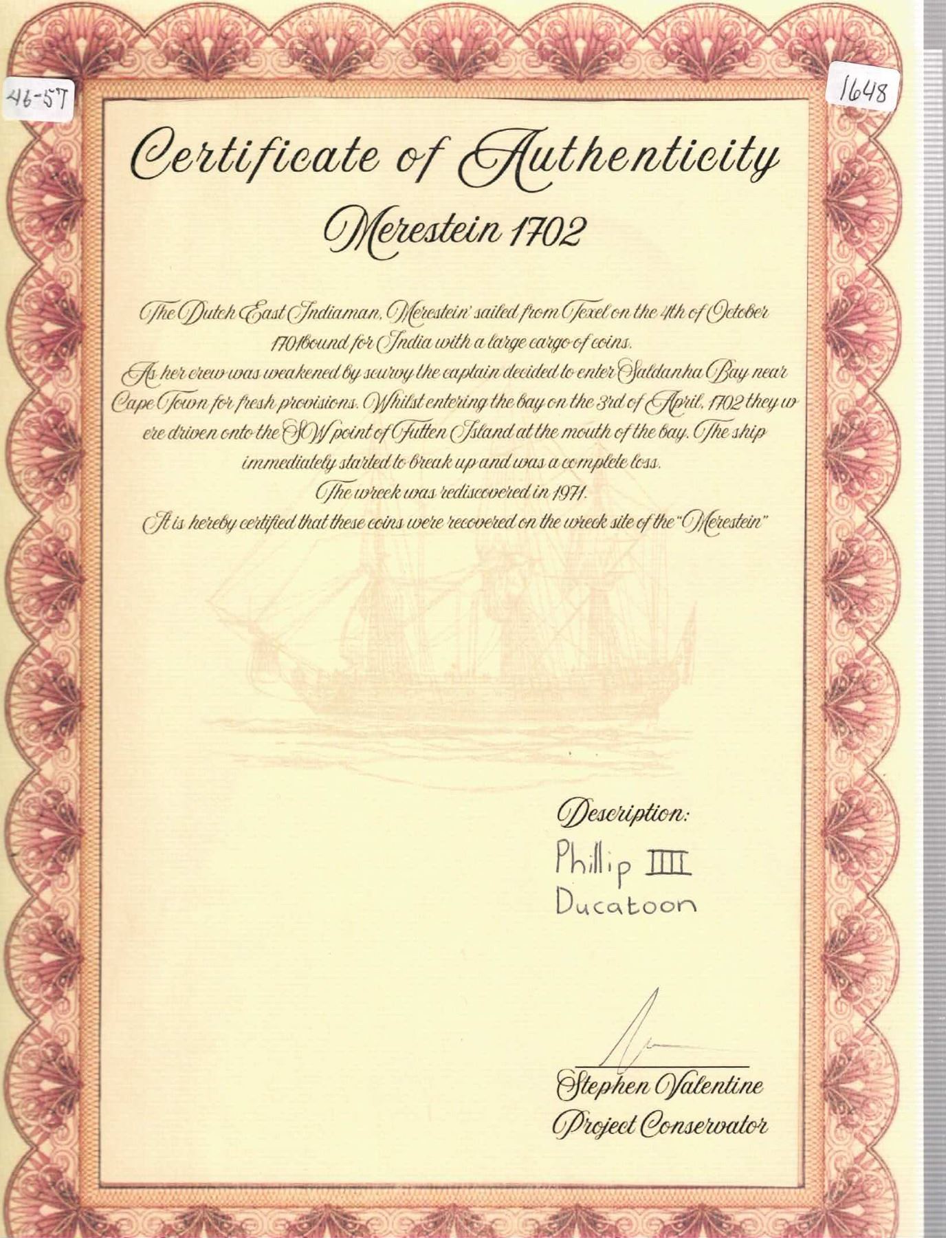NETHERLANDS (Spanish), Brabant, Brussels mint, portrait ducatoon, Philip IV, date not visible. KM-72.2; Delm-285a. 29.55 grams. Nice bold portrait and shield though date in legend just too flat to make out, matte silver surfaces from minor saltwater corrosion. Pedigreed to the Steve Valentine Collection, with original certificate from the salvor/conservator. Recovered from: Merestein, sunk in 1702 off South Africa