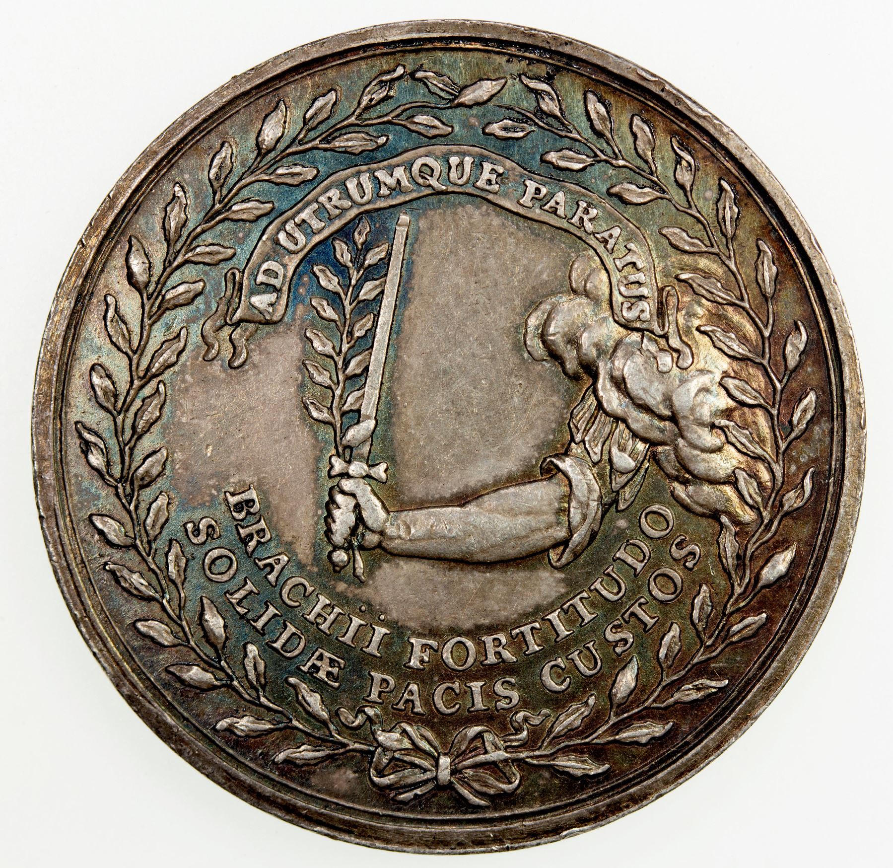 NETHERLANDS: UTRECHT: AR medal (13.31g), 1783, van Loon-596a, 34mm silver medal for the Civic Guard of Utrecht by de Meyer, arm coming out of a cloud holding sword and a laurel branch with AD UTRUMQUE PARATUS on banner above with BRACHii FORTITUDO / SOLIDAE PACIS CUSTOS below, all within a laurel wreath // arms of Utrecht with PROPATRIA ET LIBERTATE on banner around, with the banners of the eight companies encircling with INCIPE MARS PATRIAE / FELICIA FATA REDUCE / MDCCLXXXIII in exergue, attractive multicolored toning, plain edge, EF-AU.