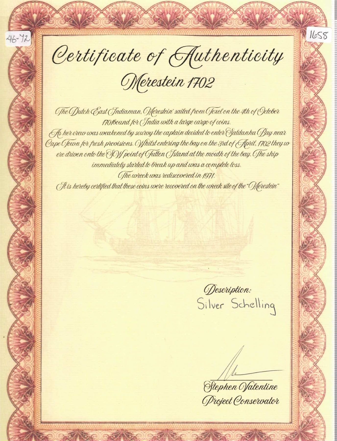 NETHERLANDS (United), Deventer, 6 stuivers (rijderschelling), 1690. KM-78. 4.06 grams. Rare type from this wreck (first of this date that we have offered), mildly corroded surface but with clear design and legends, a few small scratches. Pedigreed to the Steve Valentine Collection, with original certificate from the salvor/conservator. Recovered from: Merestein, sunk in 1702 off South Africa