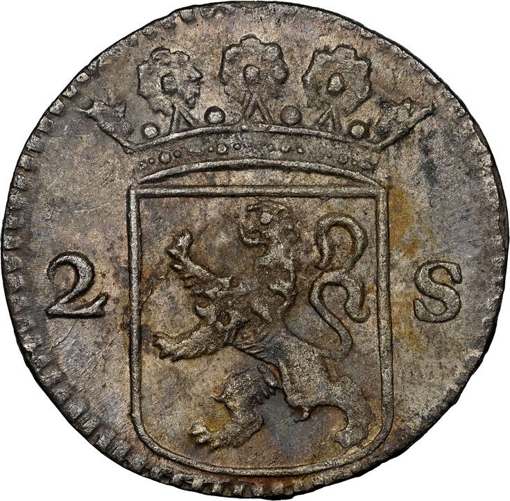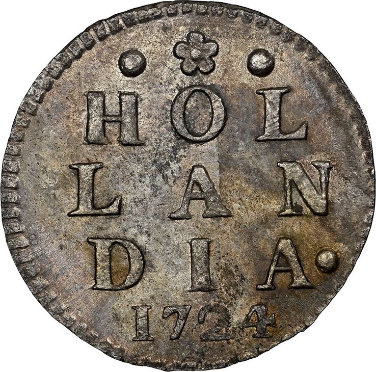 NETHERLANDS (United), Holland, 2 stuivers, 1724, NGC UNC details / saltwater damage (Shipwreck Blue Label). KM-48. Mint State with very little noticeable corrosion, toned with spots of dark gray and yellow here and there. Recovered from: Akerendam, sunk in 1725 off Norway