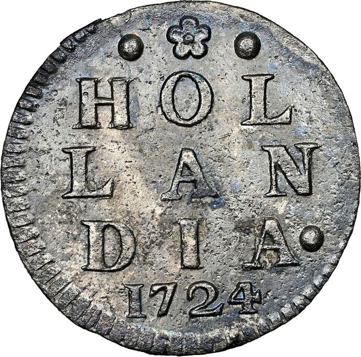 NETHERLANDS (United), Holland, 2 stuivers, 1724, NGC UNC details / saltwater damage (Shipwreck Blue Label). KM-48. Mint State with light surface corrosion yet still lustrous, unusual dark patches with vibrant blue hues. Recovered from: Akerendam, sunk in 1725 off Norway