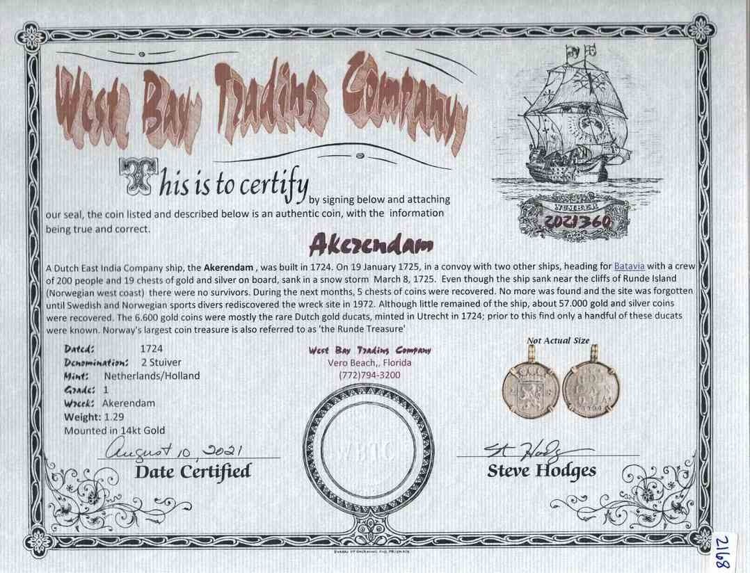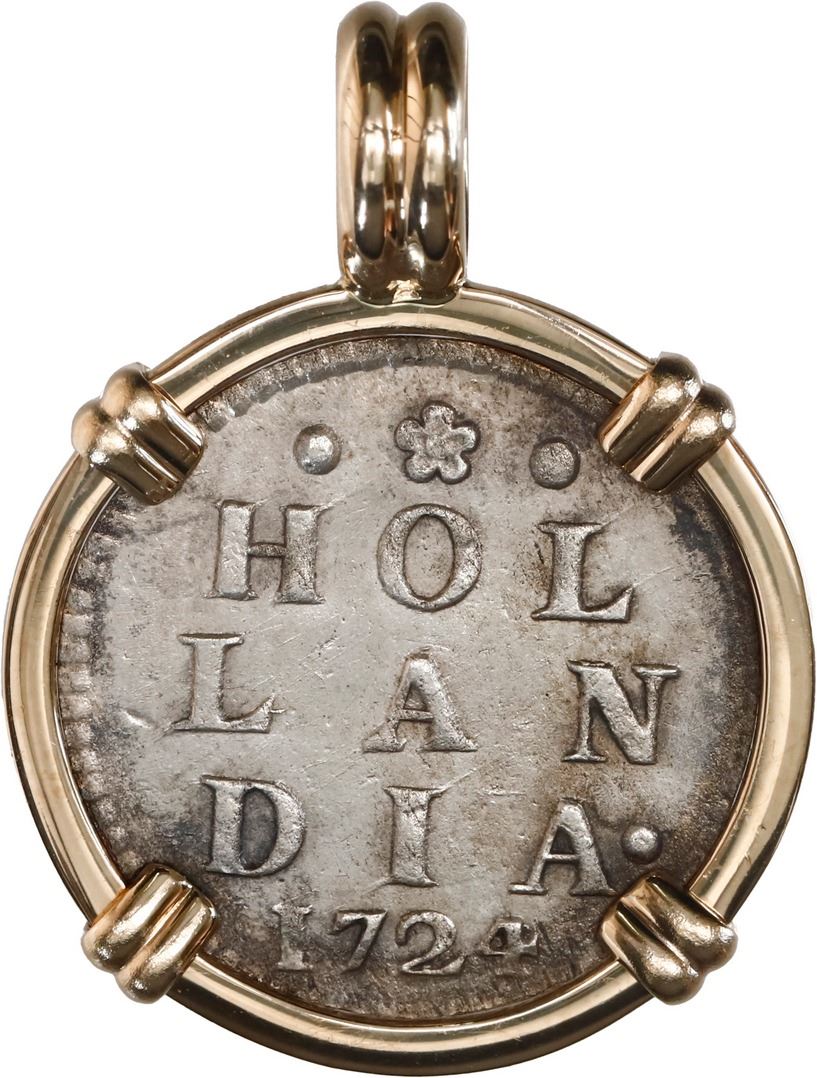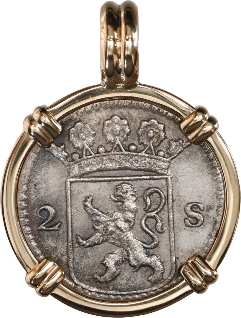 NETHERLANDS (United), Holland, 2 stuivers, 1724, ex-Akerendam (1725), mounted in 14K gold pendant. KM-48. 4.19 grams total. Lustrous, Mint State example with sharply struck lion and crown, very minimal surface corrosion around the edges. From the Akerendam (1725), with photo-certificate.