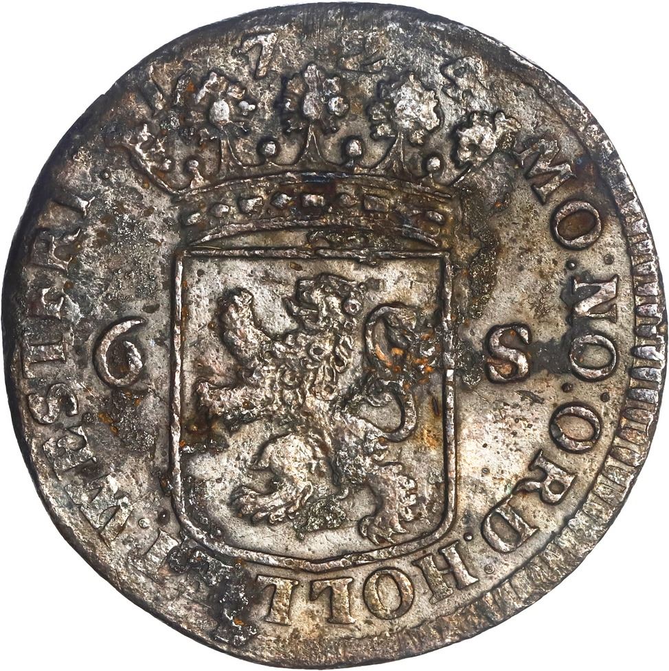 NETHERLANDS (United), Westfriesland, 6 stuivers, 1724. KM-102.2. 3.68 grams. Lightly corroded and encrusted piece with fairly sharp AU details, scarce denomination in a popular design found in very small numbers (believed to be private money for the crew of the ship). Recovered from: Akerendam, sunk in 1725 off Norway