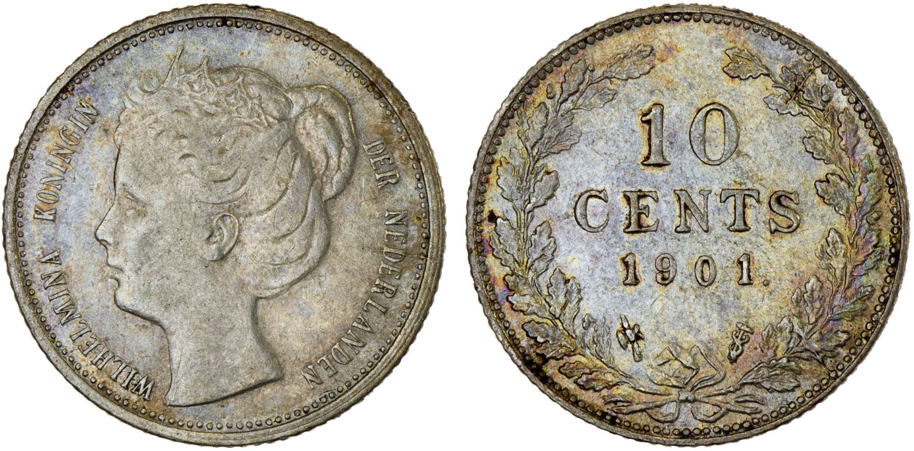 NETHERLANDS: Wilhelmina I, 1890-1948, AR 10 cents, 1901, XF