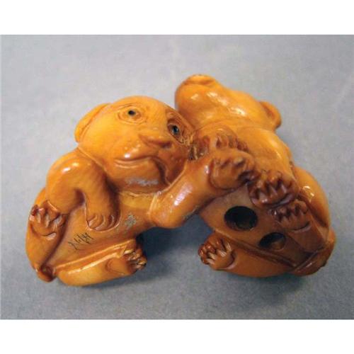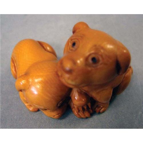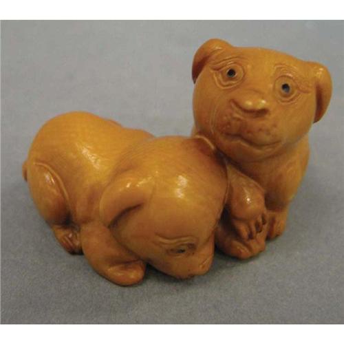 NETSUKE OF TWO PUPPIES artist signed length: 2"