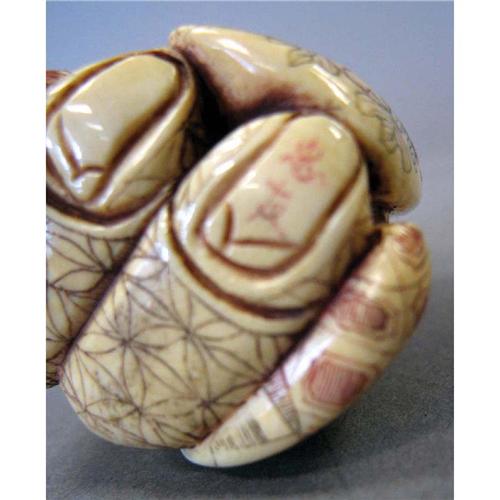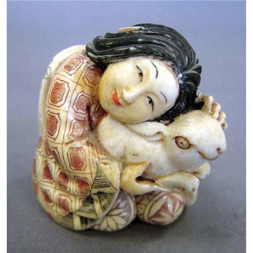 NETSUKE w/color detail artist signed girl with bunny rabbit
