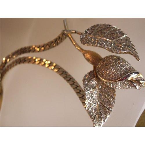 Highly collectible, fashion jewelry designer, Nettie Rosenstein. Known for her silver and vermeil jewelry as well as very ornate, delicately set gemstone pieces. Brilliant white rhinestones and heavy gold tone plated that looks like the real thing. <p>Measurement: 15" Length, hook closure. The necklace front pendant measures 3" Length x 2" Width. <p>Condition is fine with one of the smallest pave' stones that have darkened.