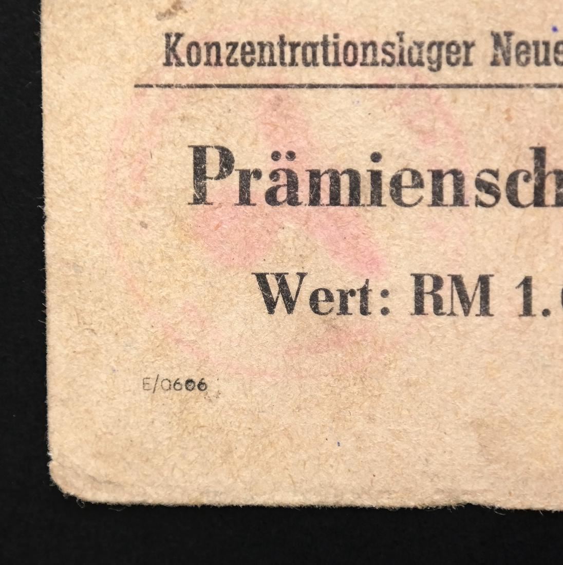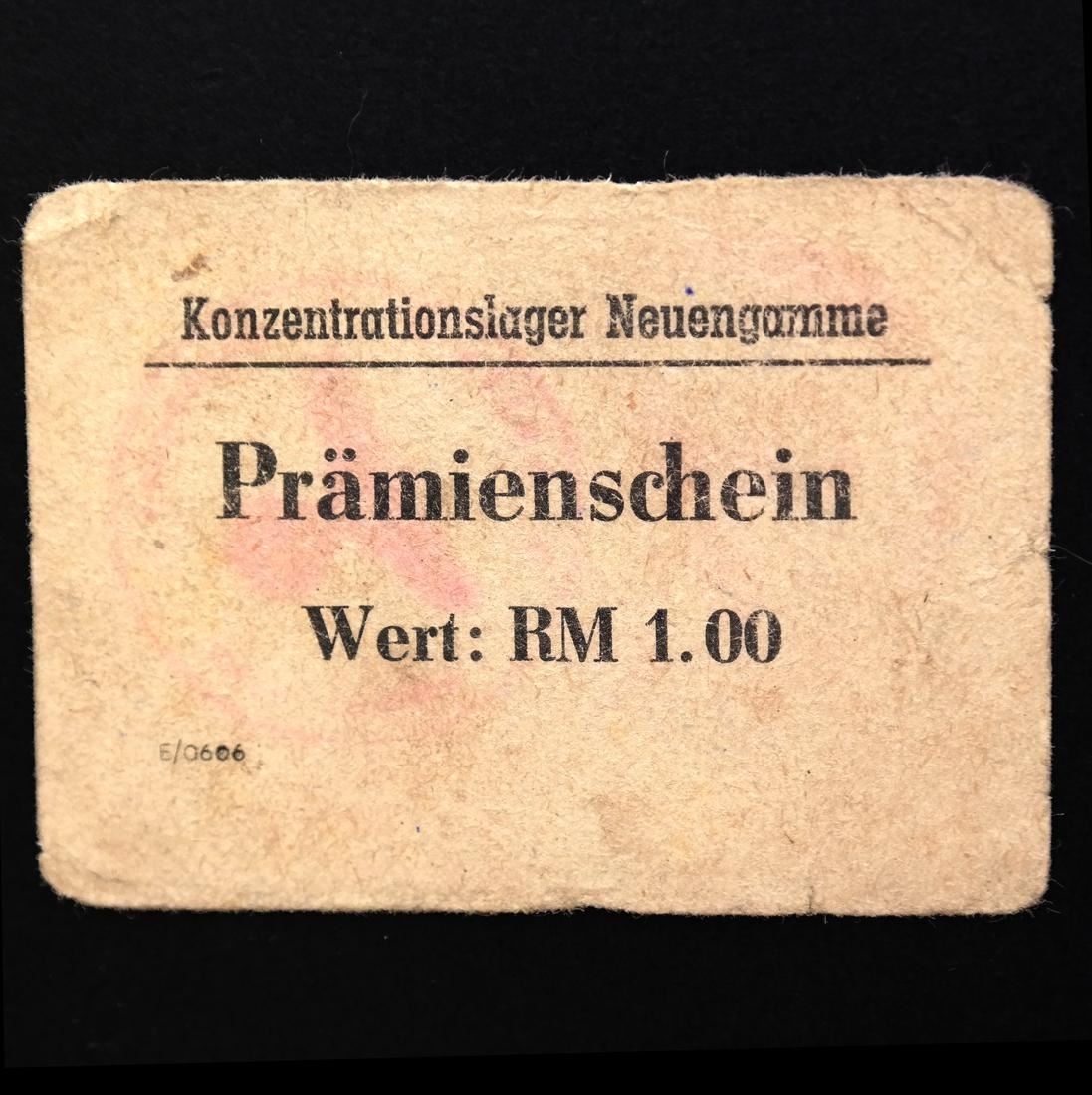 Konzentrationslager Neuengamme / Prmienschein / Wert: RM 1.00 on cream card, magenta control handstamp, measures approx 71 by 52mm, creases, tiny edge tears and soiling, F-VF.