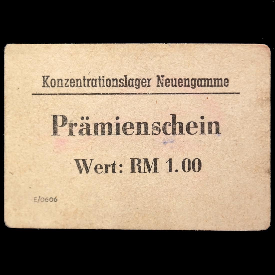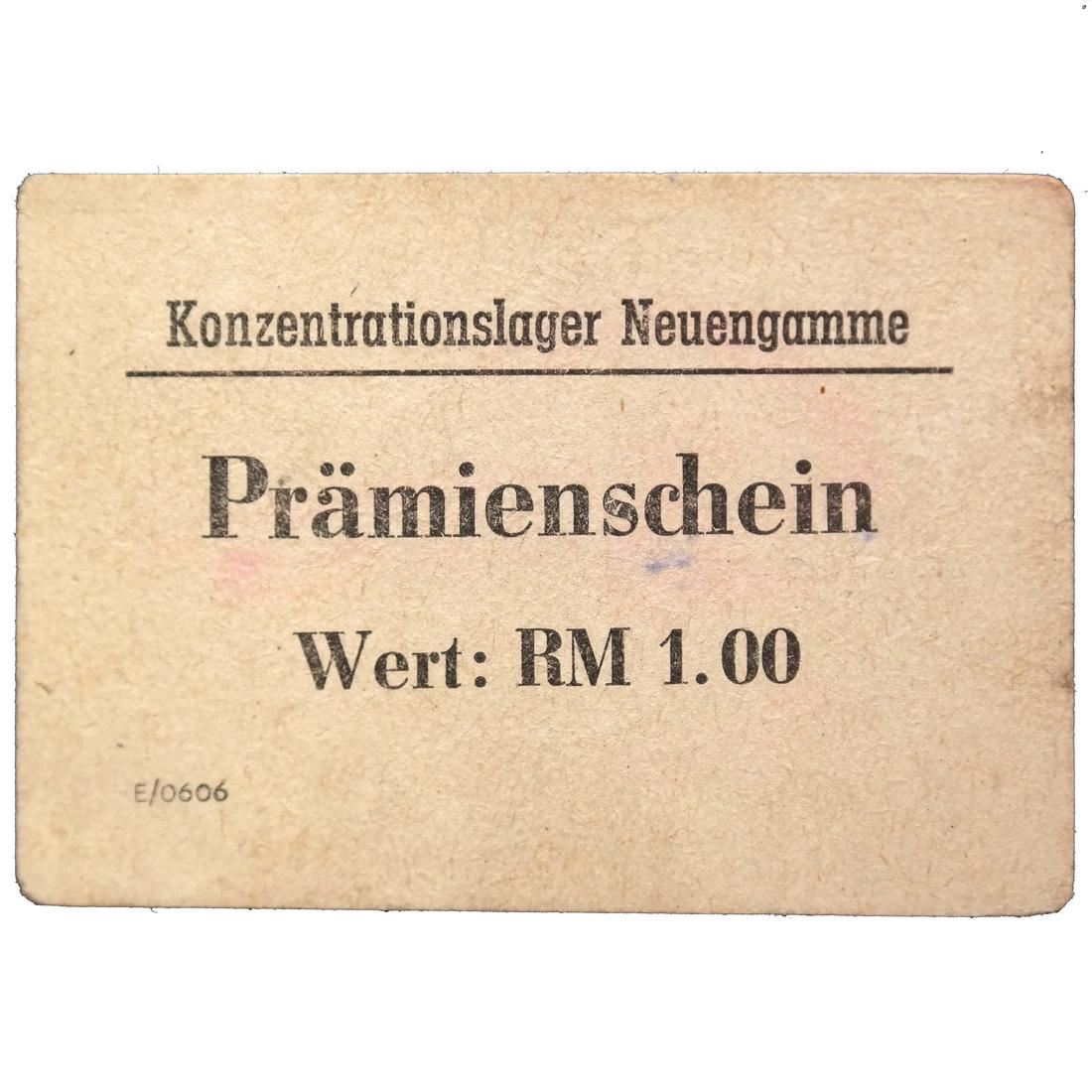 Konzentrationslager Neuengamme / Prmienschein / Wert: RM 1.00 on cream card, magenta control handstamp, measures approx 70 by 48/50mm, some soiling, VF.