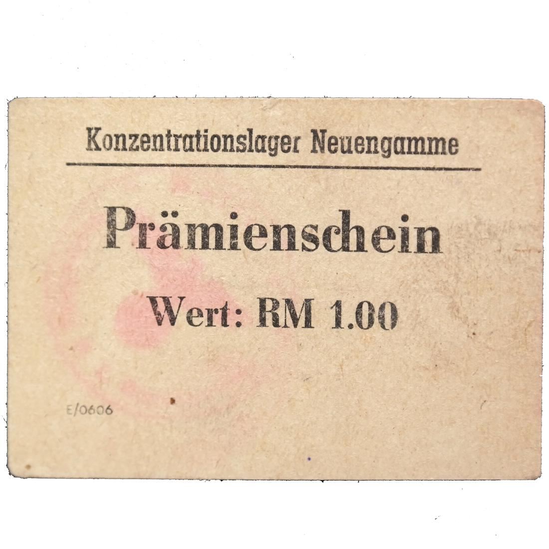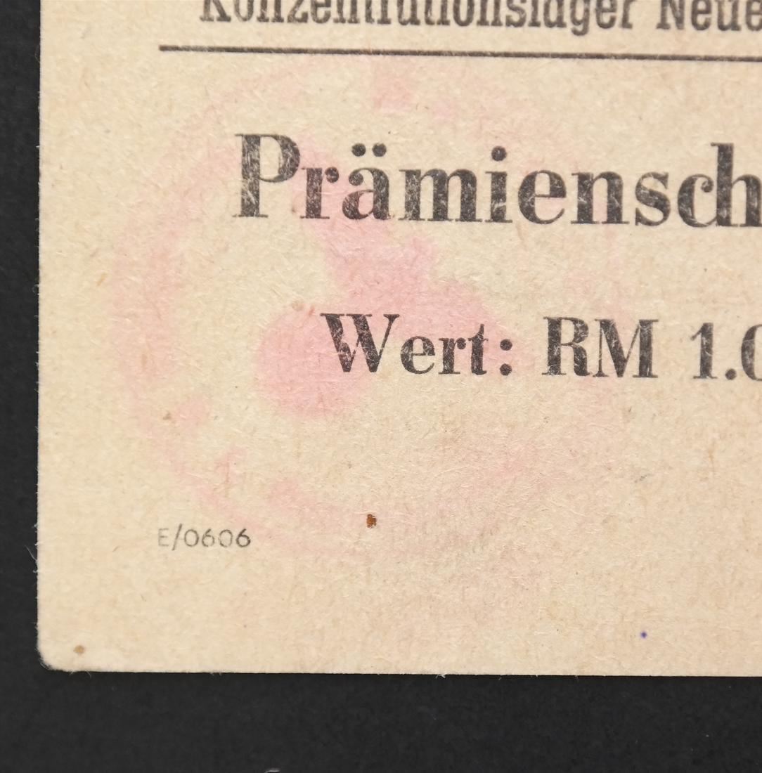 Konzentrationslager Neuengamme / Prmienschein / Wert: RM 1.00 on cream card, magenta control handstamp, measures approx 70 by 50mm, tiny edge tear at top and soiling, VF.