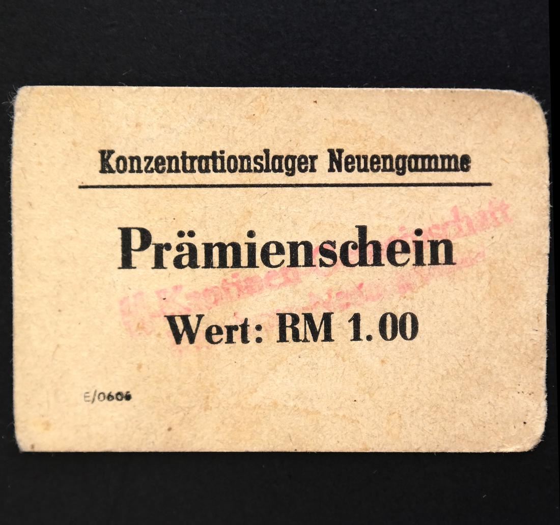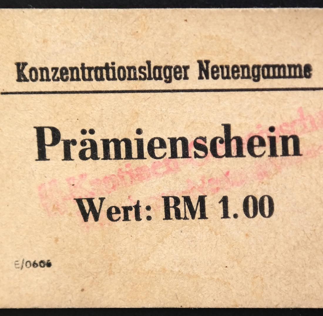 Konzentrationslager Neuengamme / Prmienschein / Wert: RM 1.00 on cream card, SS-Kantinen-Gemeinschaft / Hamburg-Neuengamme magenta handstamp, measures approx 70 by 48/50mm, light soiling, VF.