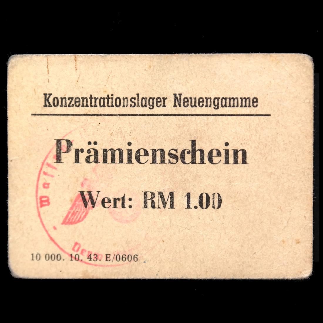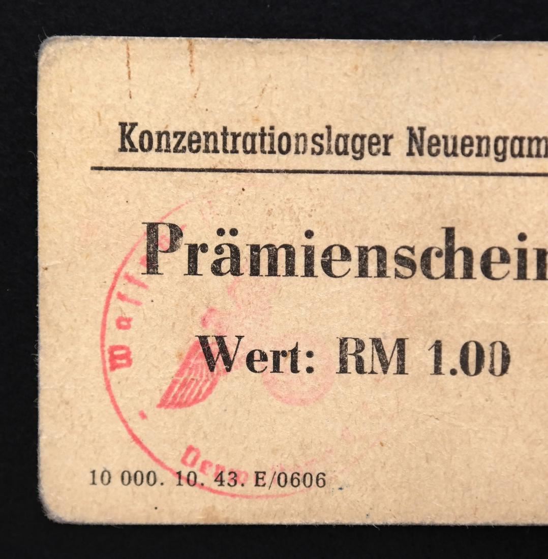 Konzentrationslager Neuengamme / Prmienschein / Wert: RM 1.00 on cream card, magenta control handstamp, measures approx 69 by 48/50mm, some staining and soiling, VF.